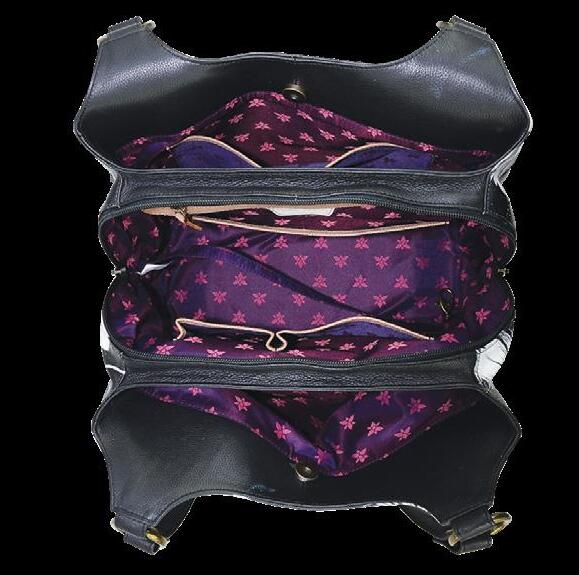 Two open compartments with magnetic snap button, top zip central compartment, one zippered wall pocket, two multipurpose pockets, rear full length zippered pocket.