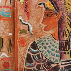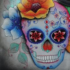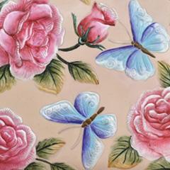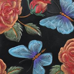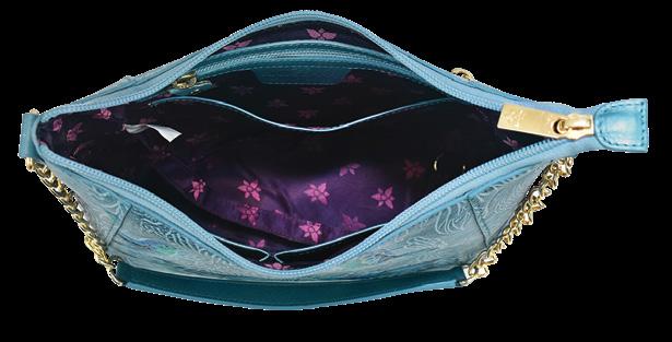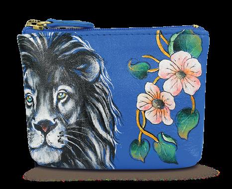 Hand painted original artwork. Genuine leather exterior and trim. Top zip closure. One open wall pocket. Two multipurpose pockets with gusset. Rear full length zippered pocket.