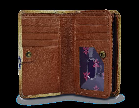 Snap button closure. Two full length zippered pockets. Six credit card holders,two ID windows, two multipurpose pockets.