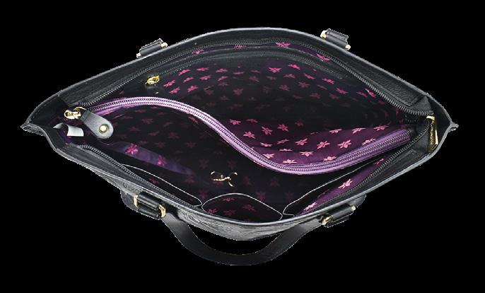 Double magnetic closure to main compartment. One open wall pocket, one zippered wall pocket, two multipurpose pockets and a zippered partition pocket. Rear full length zip pocket and slip in cell pocket.