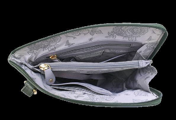Top zip entry to main compartment. One zippered wall pocket, one open wall pocket. Two multipurpose pockets with gusset. Rear full length zippered pocket and slip in cell pocket.