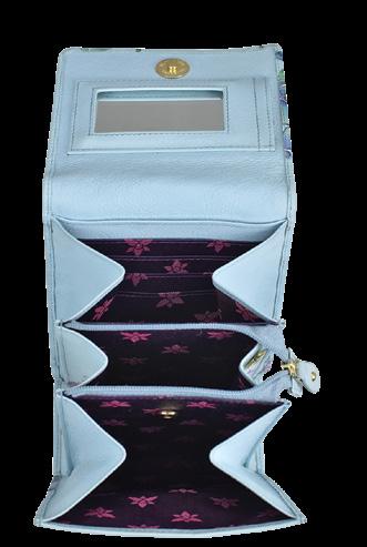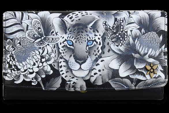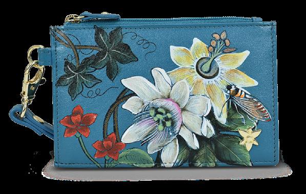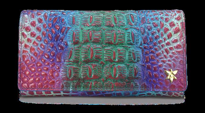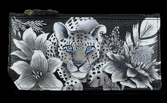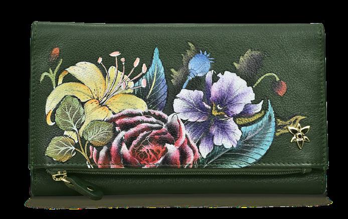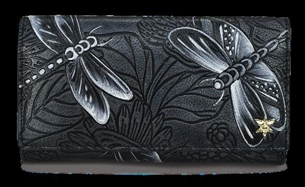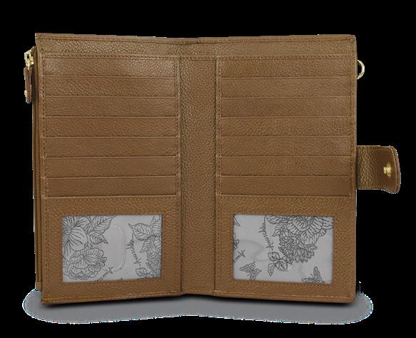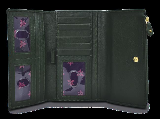 Flap entry with snap button. Twelve card holders with RFID protection. One zippered compartment. One slip in multipurpose pockets. Rear full length zippered coin pocket. Accordion style gusset opens 3” wide.