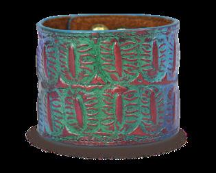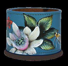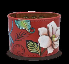 A staple piece that can be worn every day to add a dash of flair. This painted leather cuff accented with antique hardware is classic and chic. Lined with suede leather for comfort. Hand painted original artwork, genuine leather exterior and trim, adjustable wristband with snap button. Dimensions: : 9.5” x 2”. Wrist size : 7” - 8”