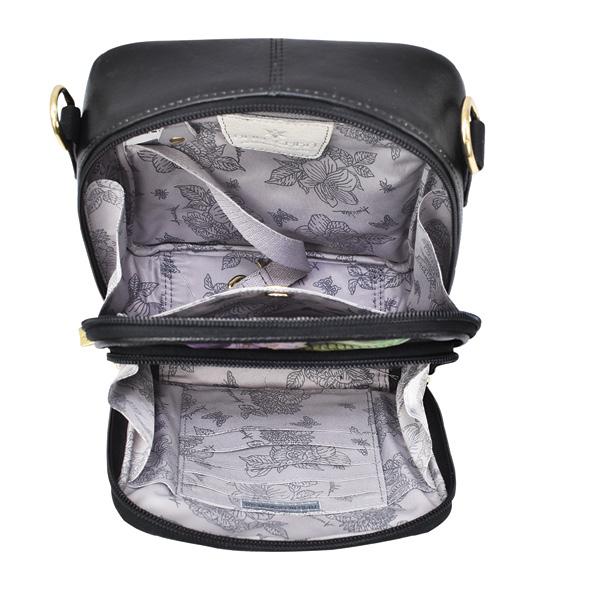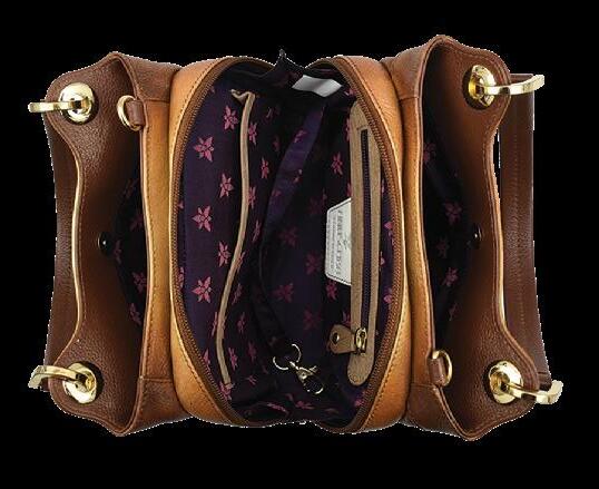 Top zip entry, one zippered wall pocket, one open wall pocket. Two multipurpose pockets with gusset. Rear full length zippered pocket and one cell pocket.