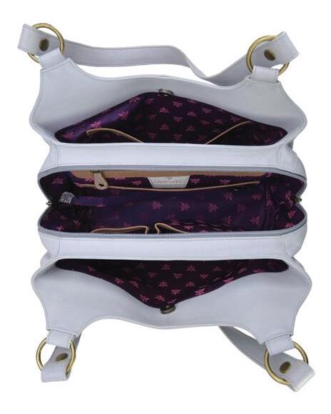 Top zip entry to main compartment. Central top zippered partition compartment. One zippered wall pocket, two multipurpose pockets with gusset. Rear full length zippered pocket. Slip-in cell pocket.