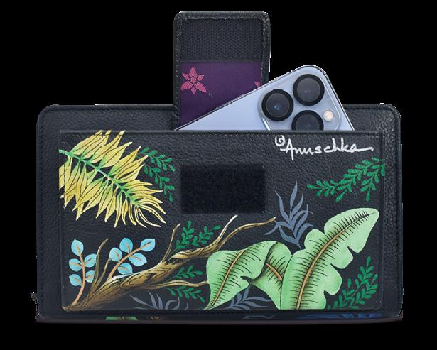 Front phone compartment with magnetic snap button. Fits up to iPhone15 Pro™. All round zippered organizer compartment with twelve card holders and one ID window.