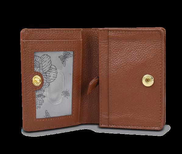 Compact enough to throw into a larger bag, this beauty has a flap with snap button entry, four RFID protected card holders and one ID window. There is a rear slip pocket for bills, coins and more.