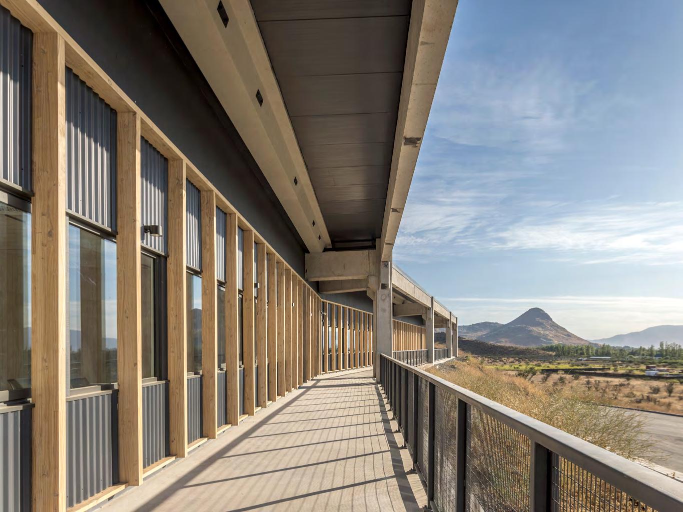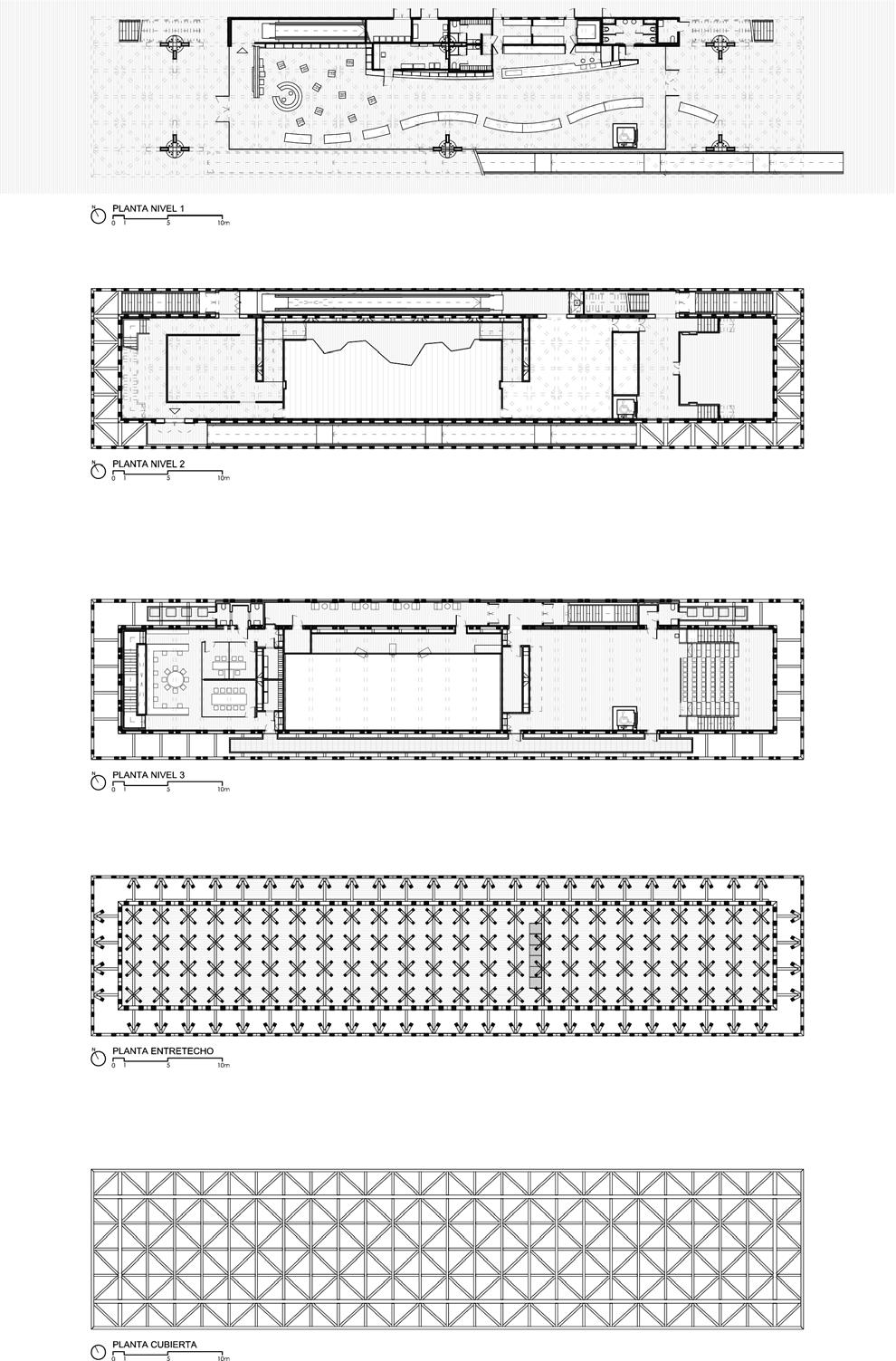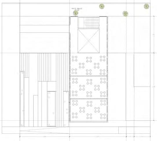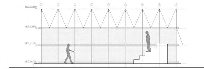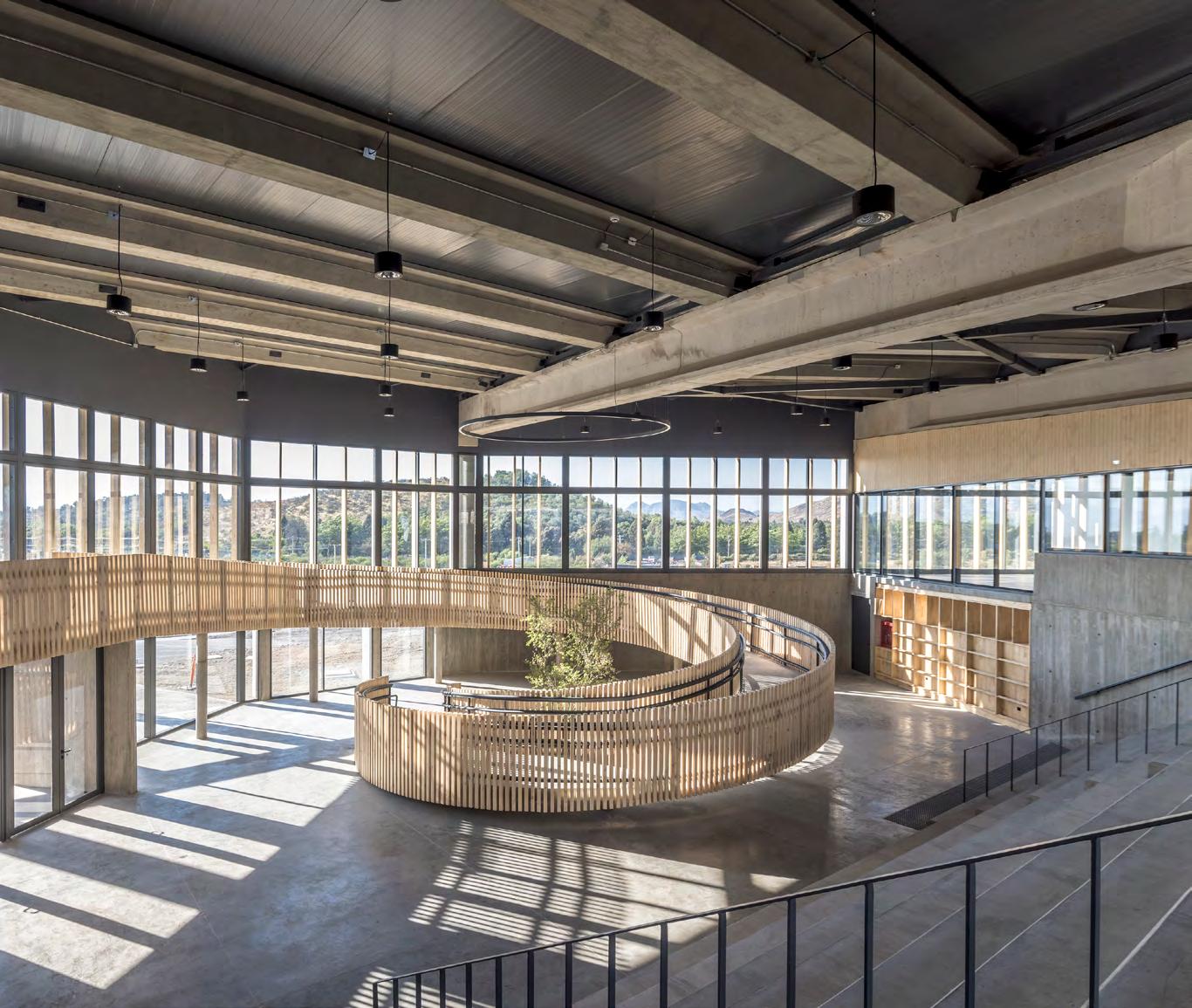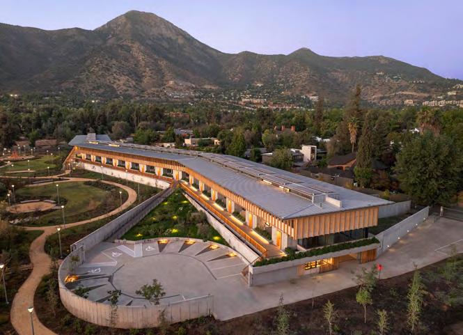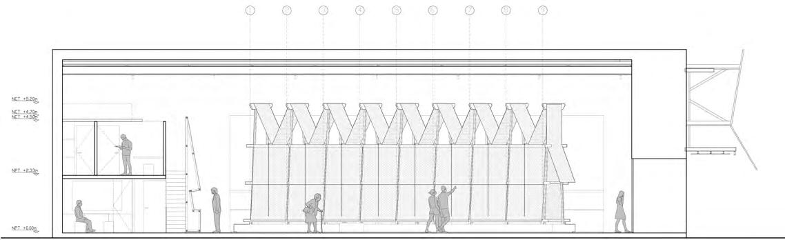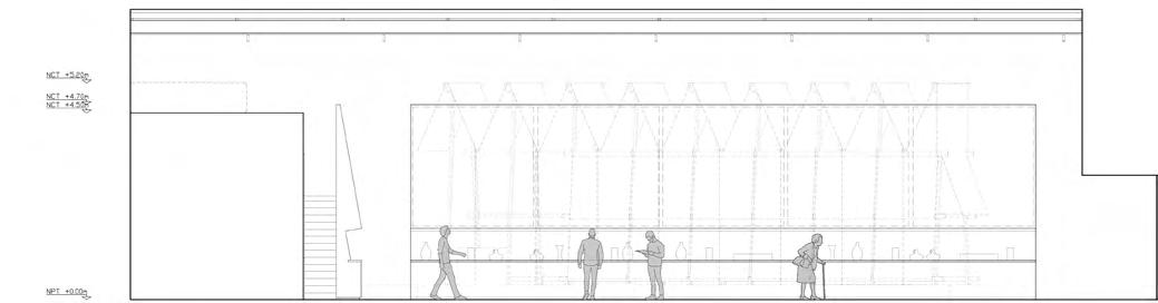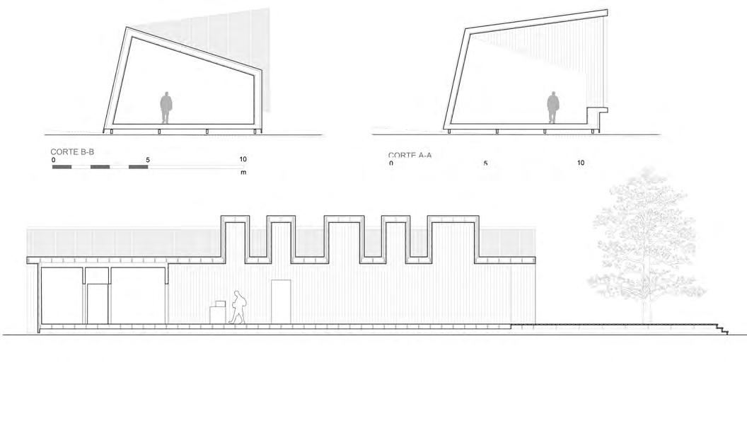 In terms of design, although the construction system favors openings at the ends of the building over those on its length, in this case, different geometry frames were alternated to achieve a sequence of large skylights that create a volumetric rhythm, alternate opacity, and transparency, and vertically frame the landscape and visually connect with the plaza.
