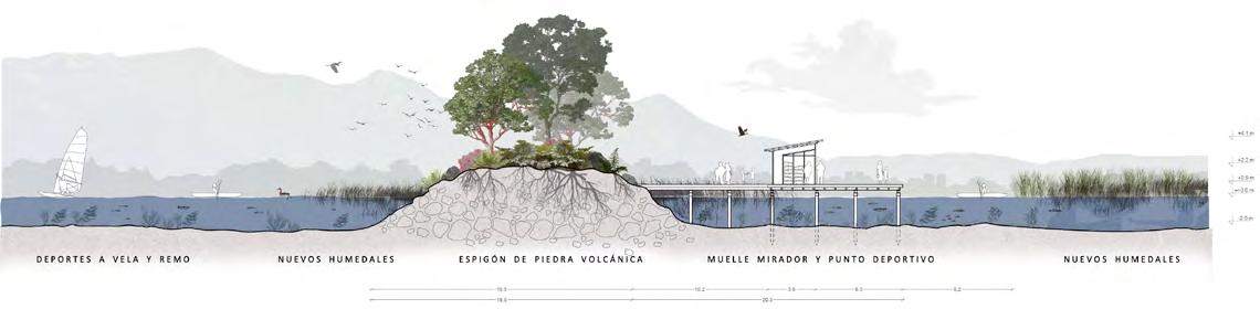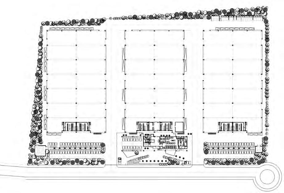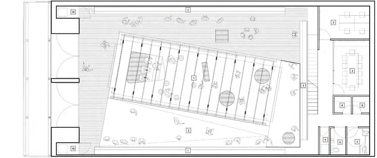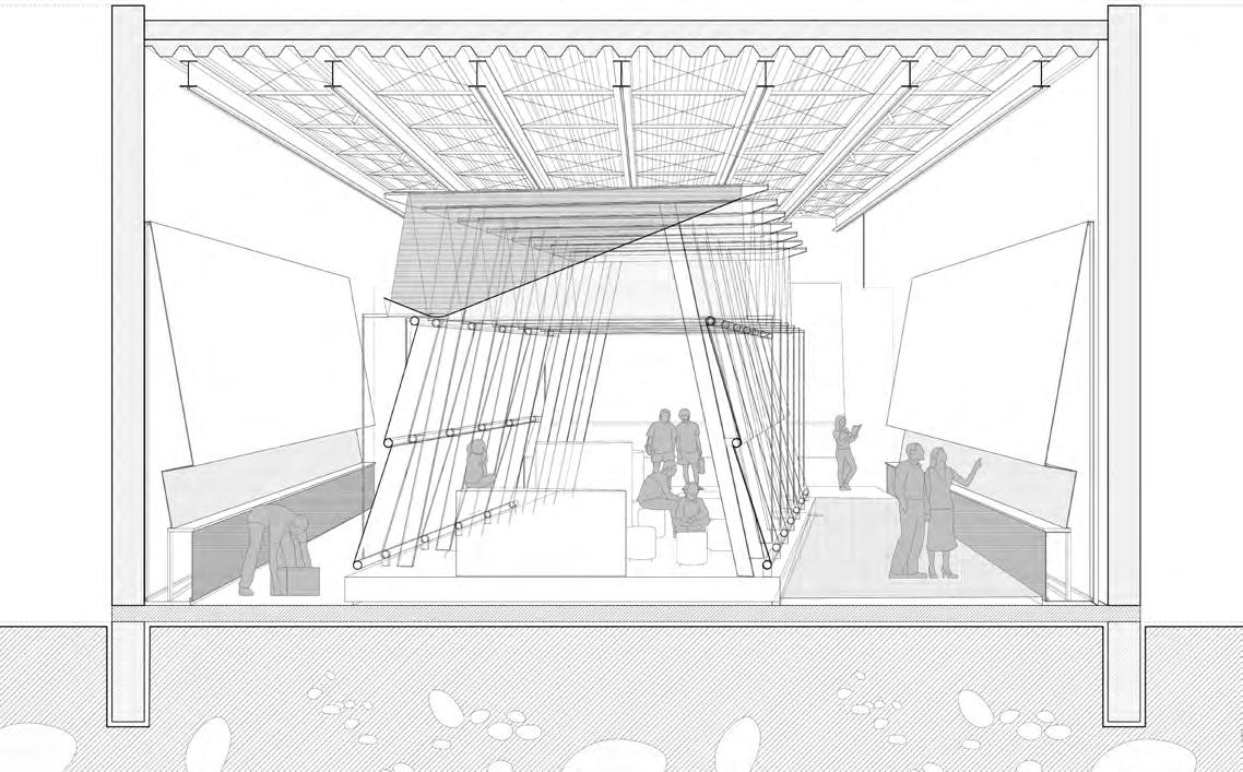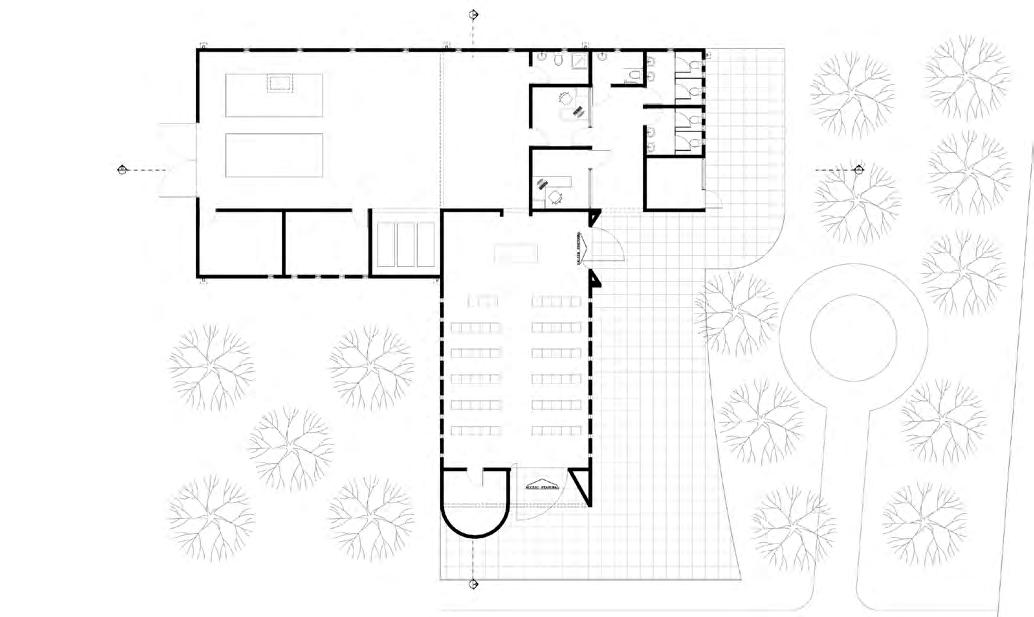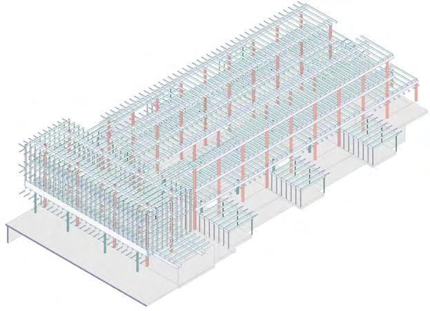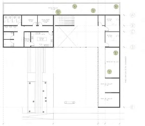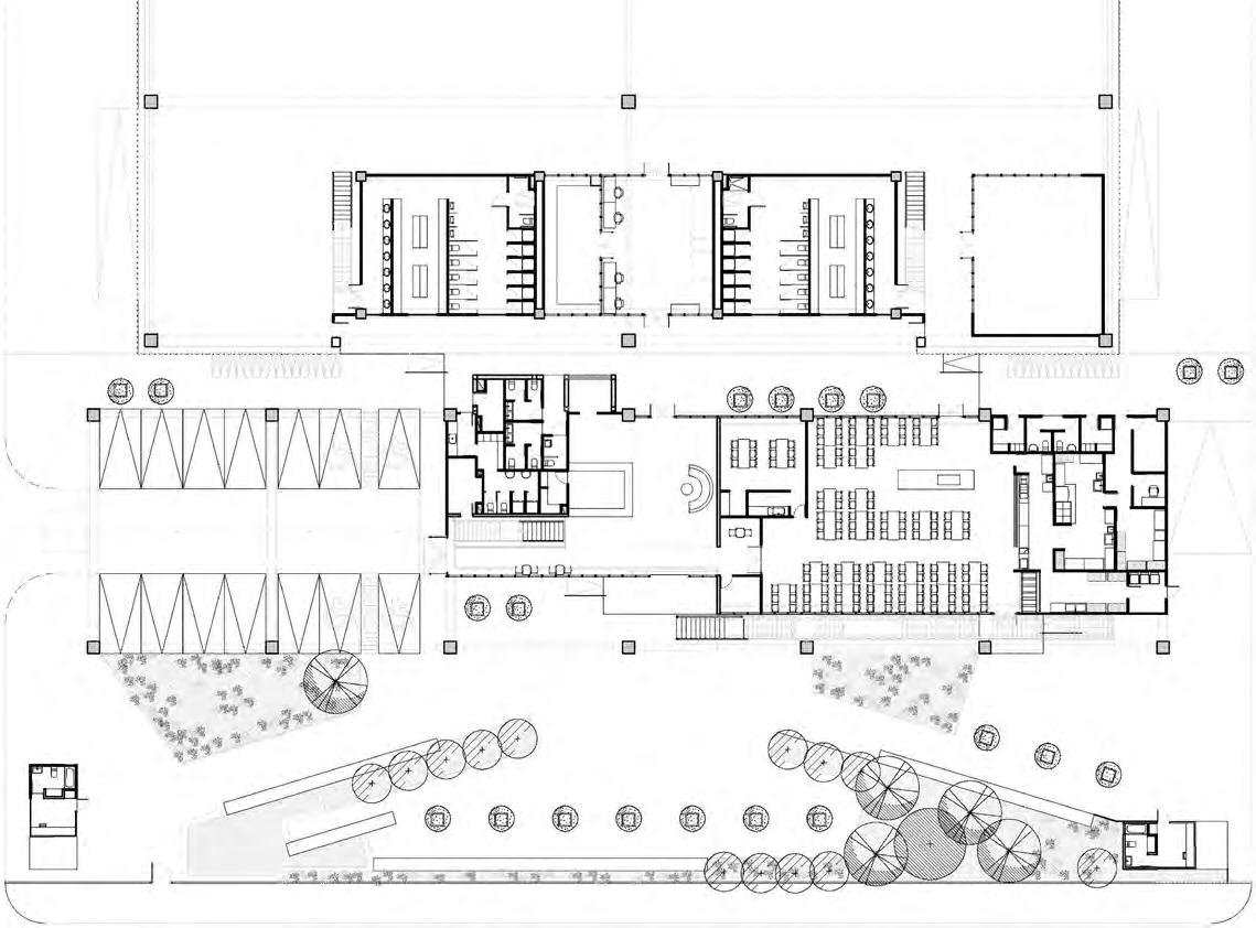 In terms of design, although the construction system favors openings at the ends of the building over those on its length, in this case, different geometry frames were alternated to achieve a sequence of large skylights that create a volumetric rhythm, alternate opacity, and transparency, and vertically frame the landscape and visually connect with the plaza.