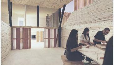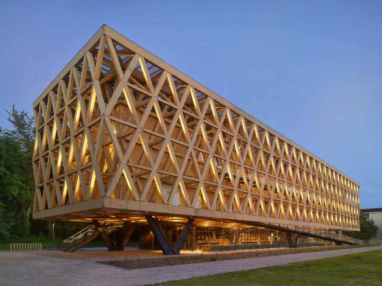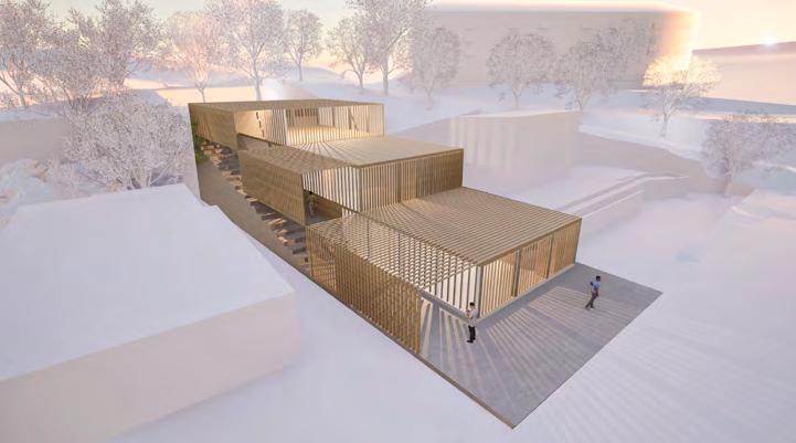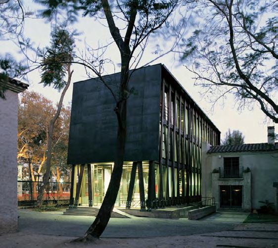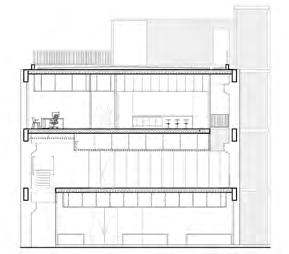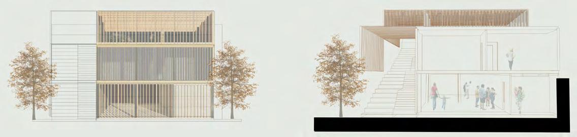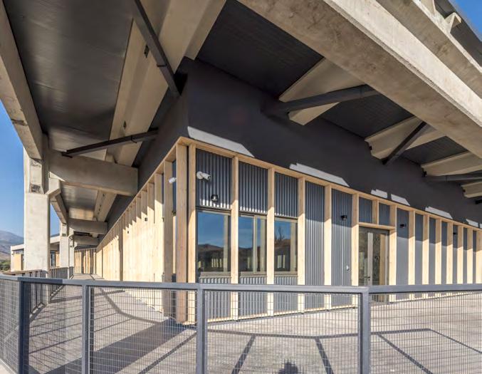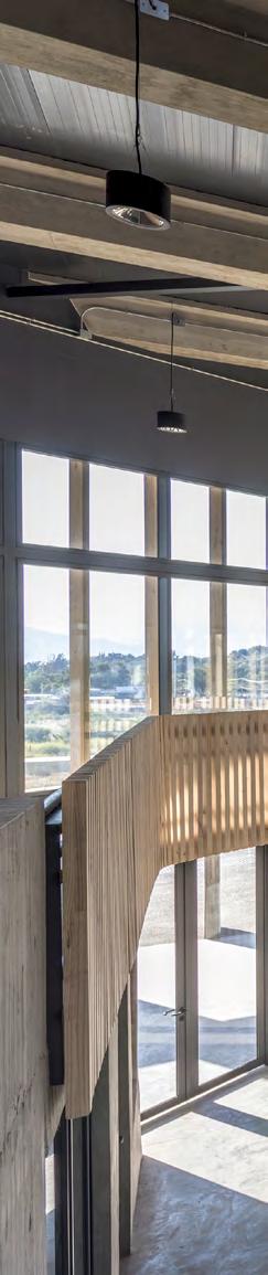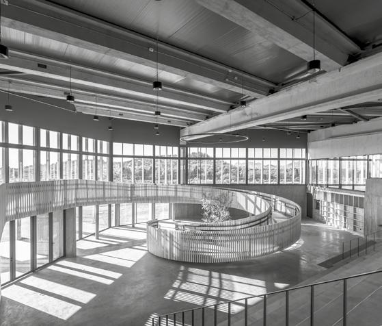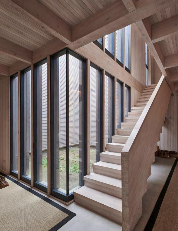 To the north, the building was left completely airtight to protect it from rain and to isolate it from the road. A dark metal cladding was used on the exterior to bring it into line with the other pre-existing buildings and to contrast it with the warm wooden interior bathed in light from the sequence of windows.!