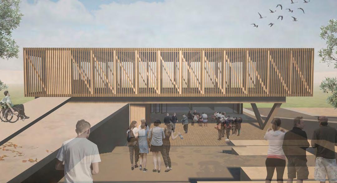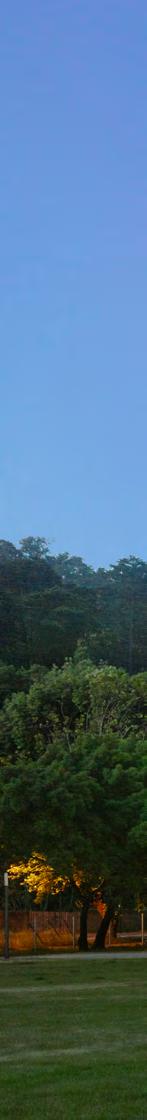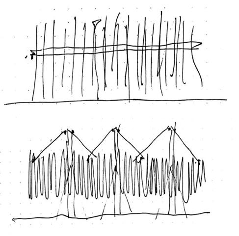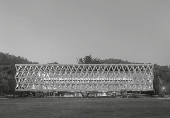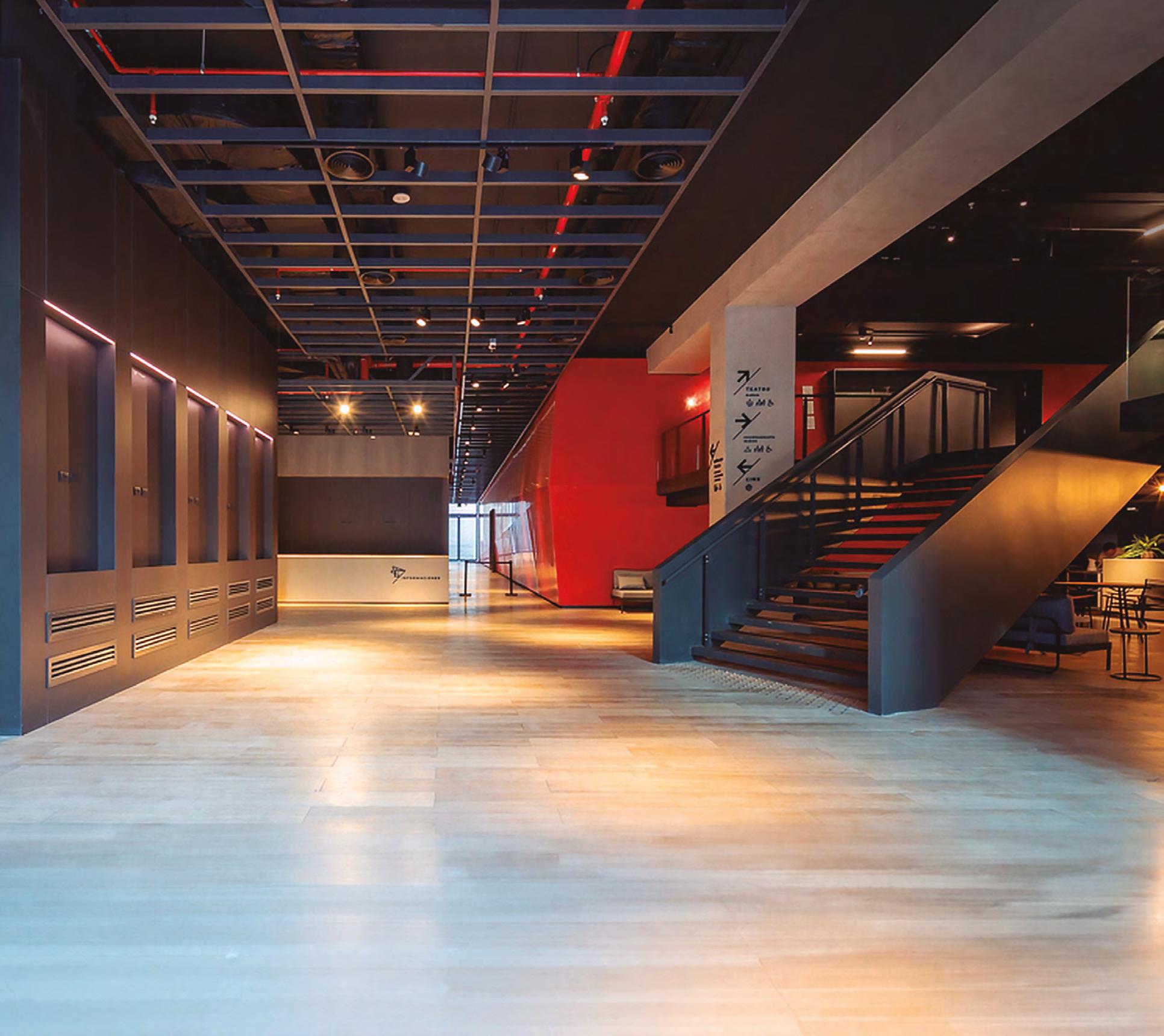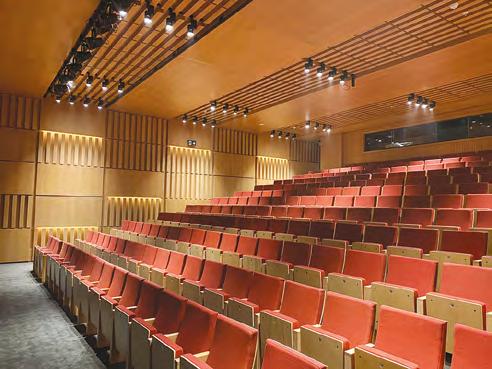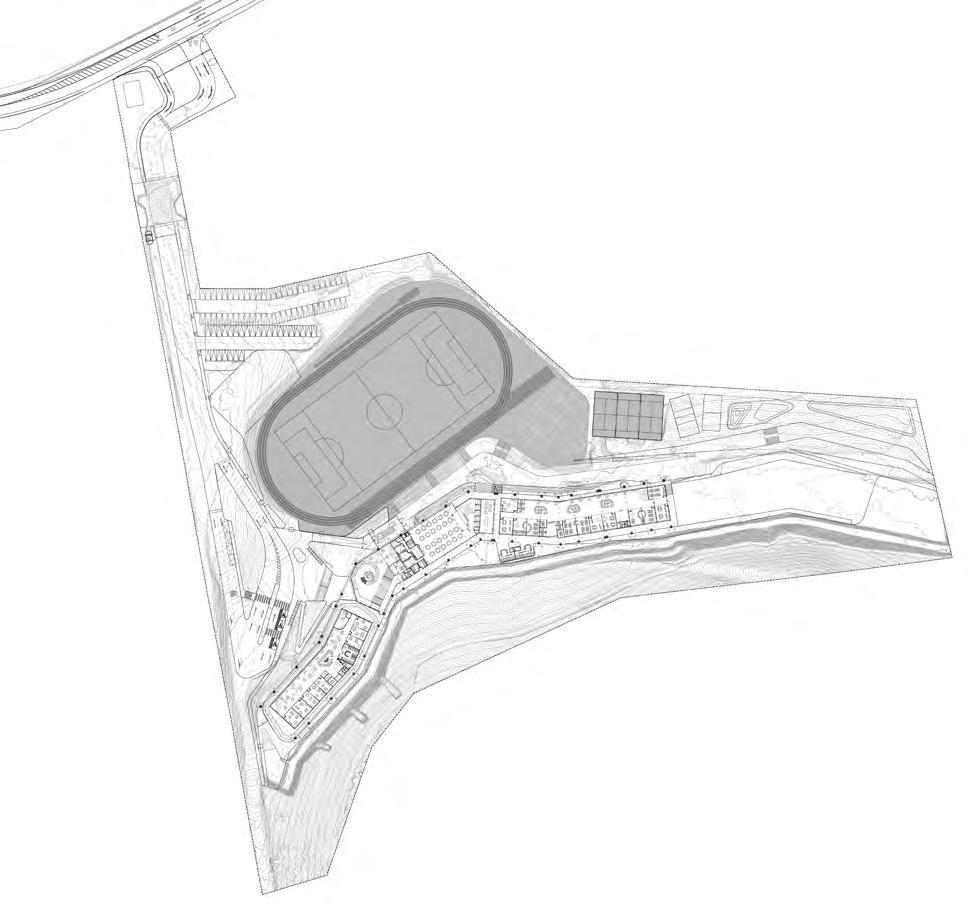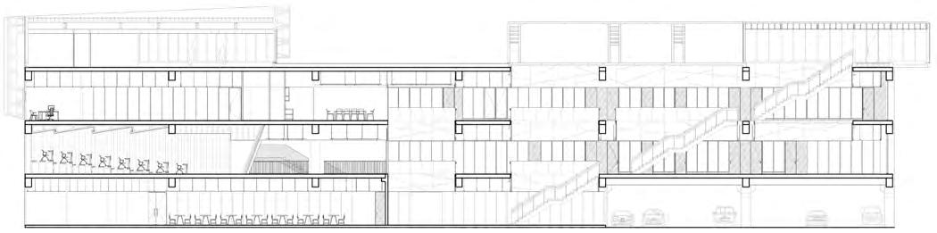 To the north, the building was left completely airtight to protect it from rain and to isolate it from the road. A dark metal cladding was used on the exterior to bring it into line with the other pre-existing buildings and to contrast it with the warm wooden interior bathed in light from the sequence of windows.!