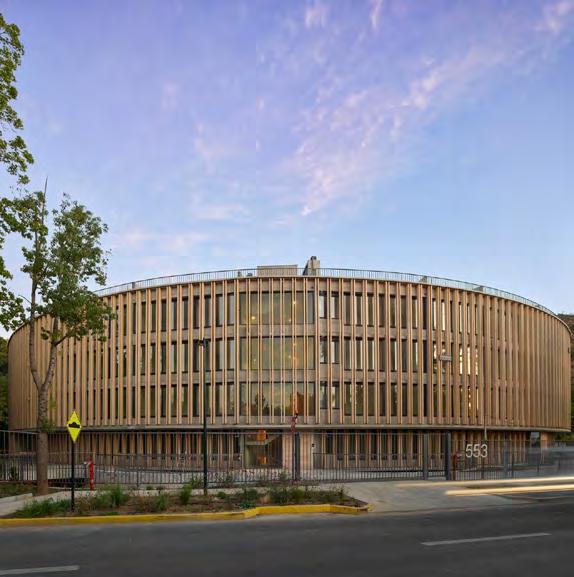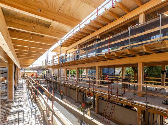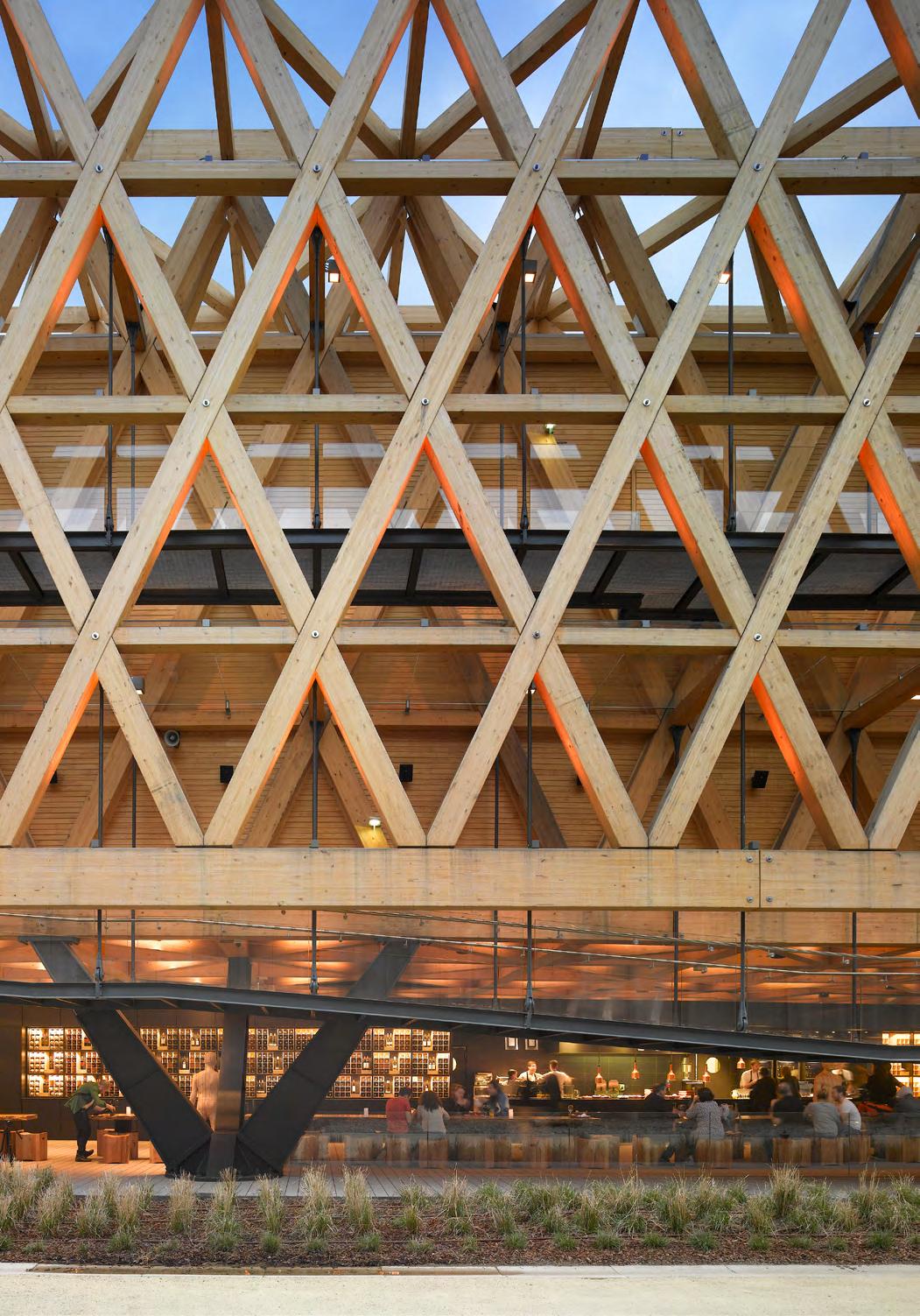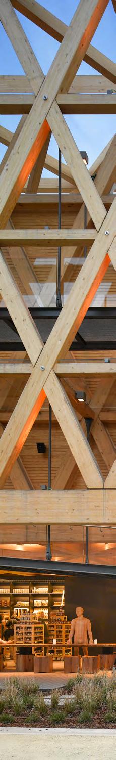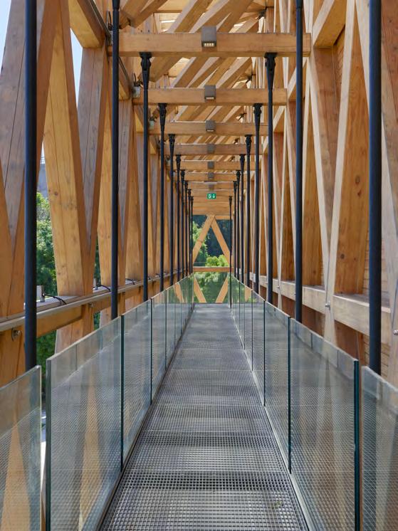 All GLT elements were brought to the site as prefabricated components and machined by a CNC robot, creating complex assemblies that allowed them to be put together like a Meccano. The panels are also prefabricated and were assembled on-site.