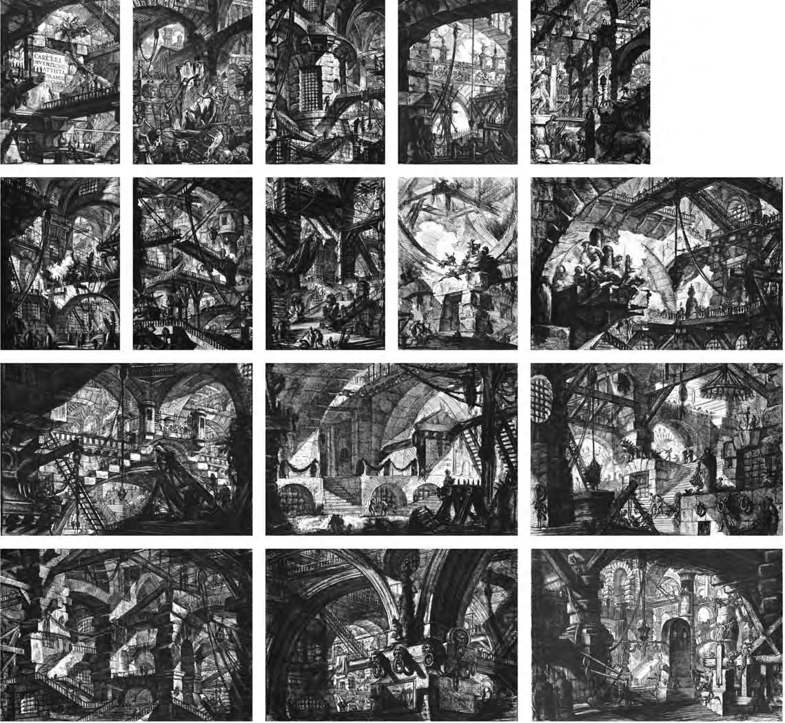 The series "Carceri d'invenzione" by Giovanni Battista Piranesi, created between 1745 and 1750, connects concrete and imagination. It consists of fourteen etchings, without titles or numbering, framed in the capricci style, an Italian genre focused on architectural fantasies represented as ruins, without perspective or proportions. Piranesi's Carceri depicts prisons with complex and dystopian architectures, fusing fictitious elements such as disproportionate arches, endless bridges, fragile walkways, and torture tools.