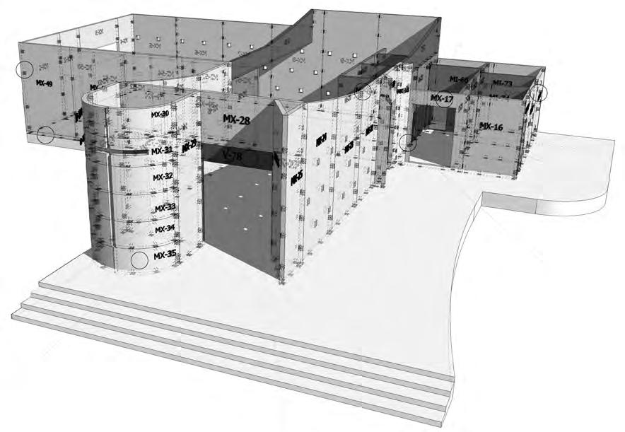 To meet the established completion deadlines, a pre-execution and pre-assembly process was implemented in workshops, where parts of the building were manufactured and assembled on a 1:1 scale before the final on-site installation. Tests and the manufacture of special moldings were carried out to efficiently shape the building, taking into account the disassembly, the numbering of parts, and the subsequent assembly sequence.