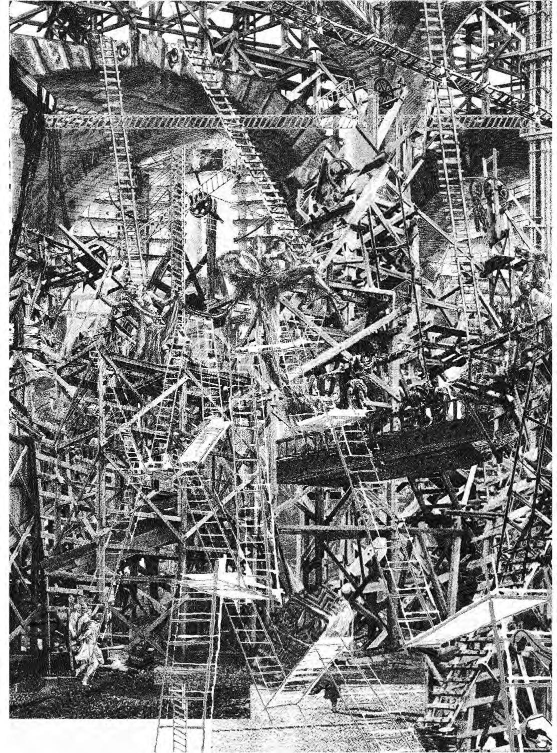 The Carceri adopt the opposite perspective looking towards a possible future translated into prison imagery: structures impossible to build at that time, even today - as Francesco Dal Co- says, to definitively ruin the lost past. The presence of time as a primordial element in Piranesi's work is also manifested in the two stages (1750-1761) since the original situation of the structures is not what is represented, but their terminal stage, where there was an intermediate point when the prisons reached their maximum splendor. This could also resemble the photomontages of contemporary artists such as Yona Friedman or Constant Anton Nieuwenhuys, which present fragmented elements connected to each other: creations of the past that aspire to transform themselves into a vision of the future.
