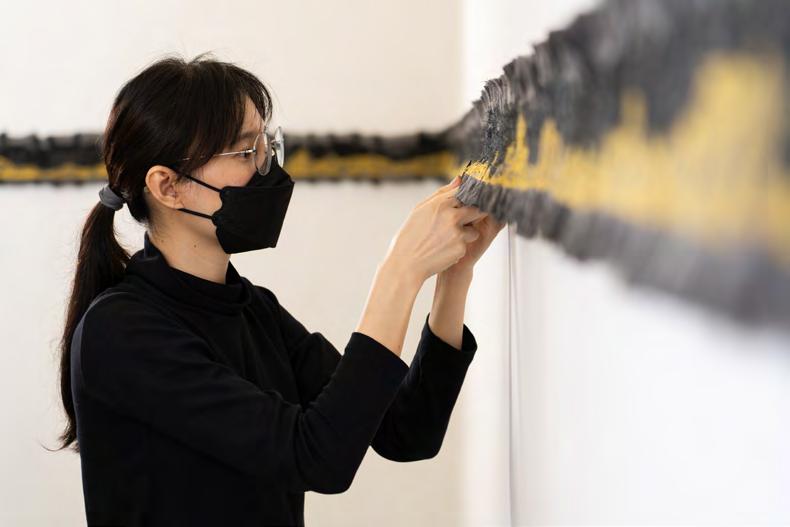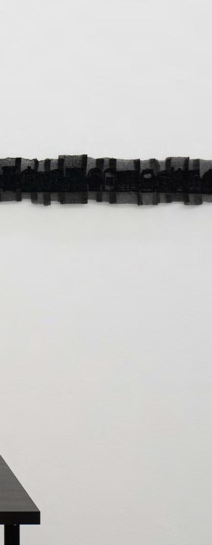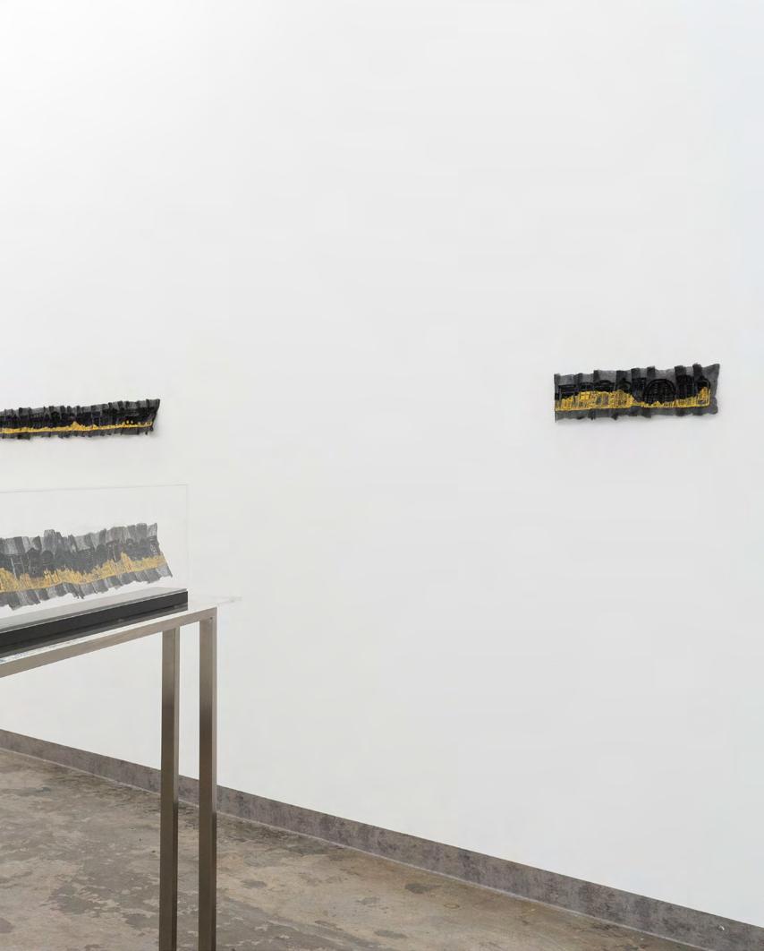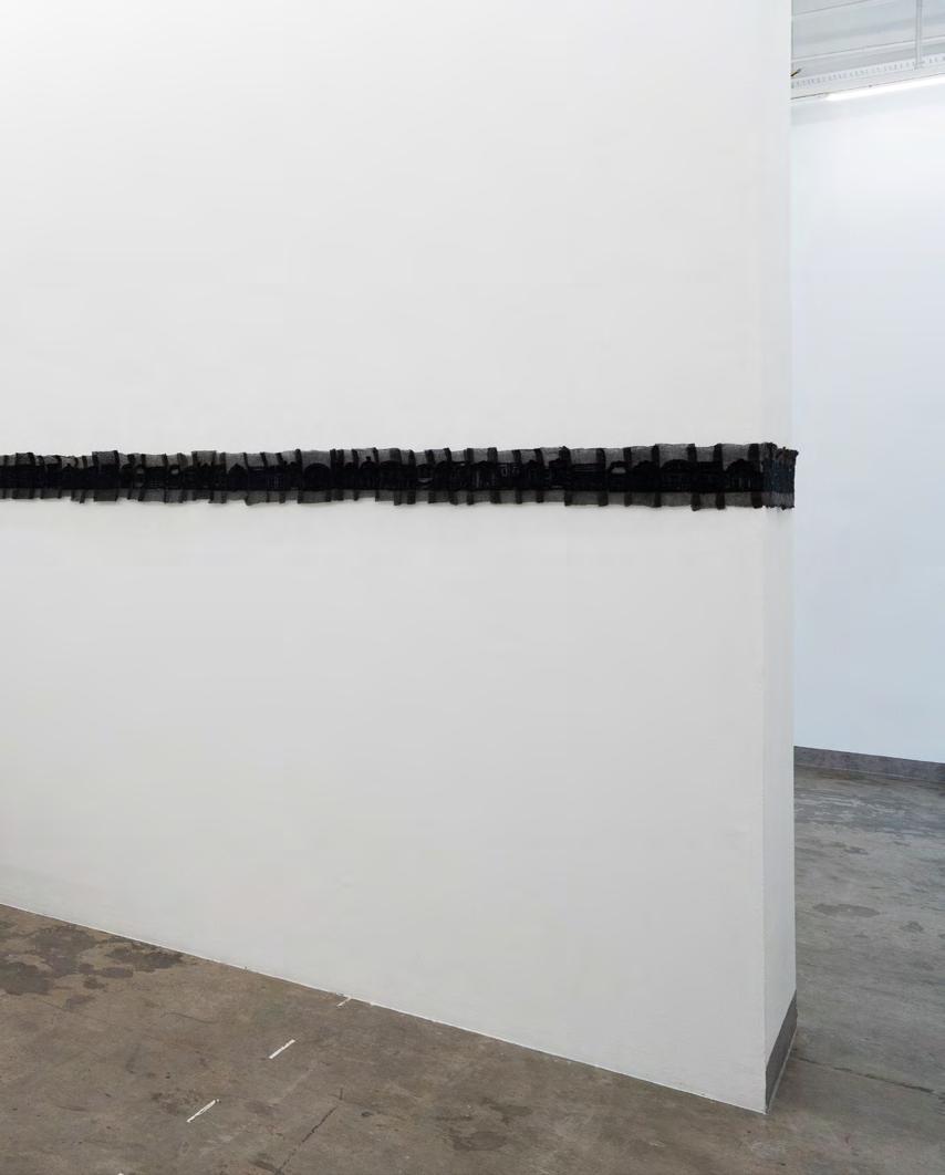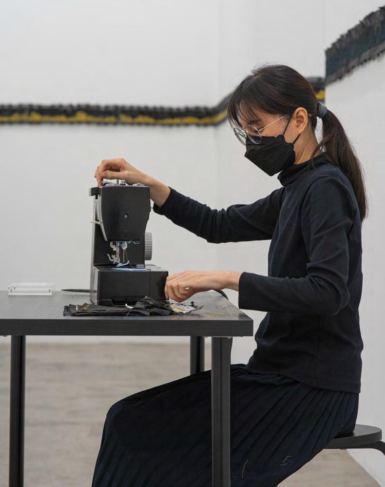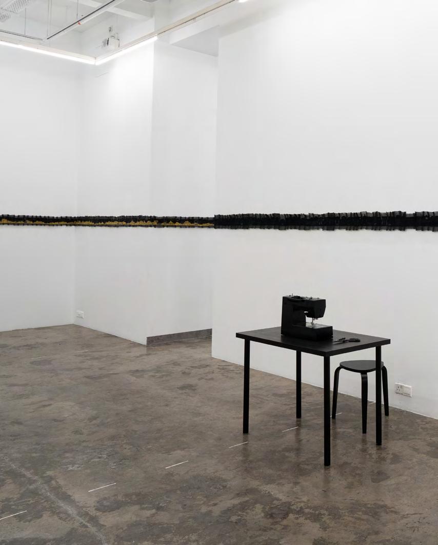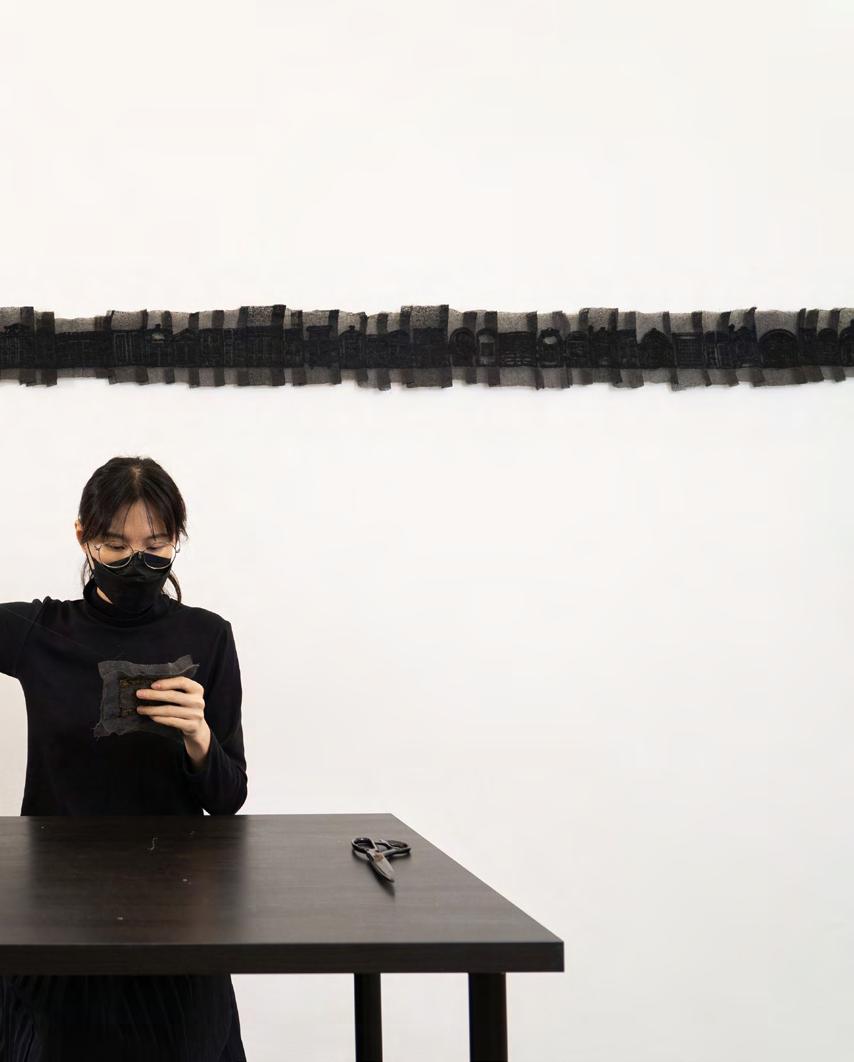 and femininity weaved into her fabric works. Yen Sum’s interest in working with fabric drew from her fascination in traditional art forms relating to fluidity and continuity. Yen Sum displays her works as a stretched version of a long handscroll embroidery of windows and mountains surrounding all the walls of the gallery space, both of which have resonance as recurring metaphors in traditional Chinese paintings, with narratives of home and memories.