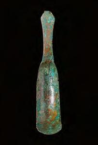 A bronze strigil with a concave scoop blade and a loop handle. This implement is designed to scrape away dirt, sweat, and oil from the skin, particularly after exercise. Strigils were commonly utilised in baths and by athletes, promoting cleanliness and health in daily rituals. For similar see: The Harvard Art Museums, Object Number 1983.7.