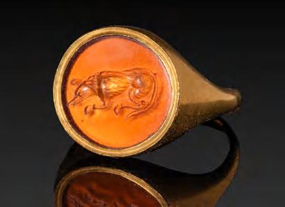 A gold ring featuring a carnelian with a round hoop D-section and a hexagonal intaglio depicting a rider on a horse. The pale orange is beautifully contrasted by the lustrous gold, while the horse is shown in profile, displaying the four legs with the front right raised, a long mane and a thin tail. The rider is most likely wearing a helmet and holding weapons. For similar see: Bagot J., El legado de Hefesto: A Memorial to a Private Collection of Ancient Rings and Glyptics, n. 430.