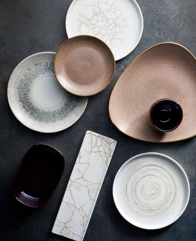 Light grey tones mixed with simplistic white are well suited for interiors intended to promote relaxation and mindfulness. To capture this trend on the tabletop try Stonecast Canvas Grey mixed with minimalist Inked Era or Alchemy Smoke. To add texture introduce Studio Prints Raku in the contemporary Jasper Grey colourway.
