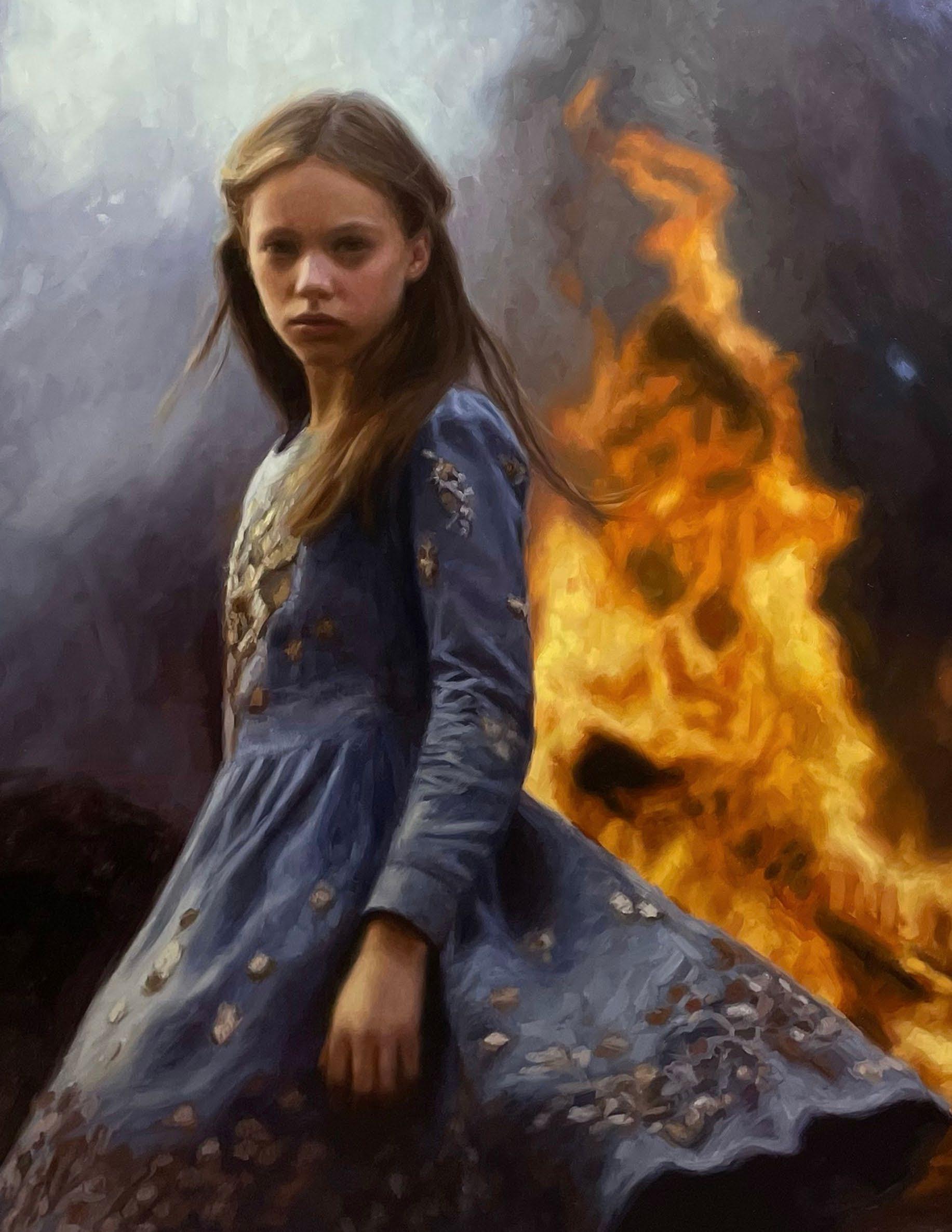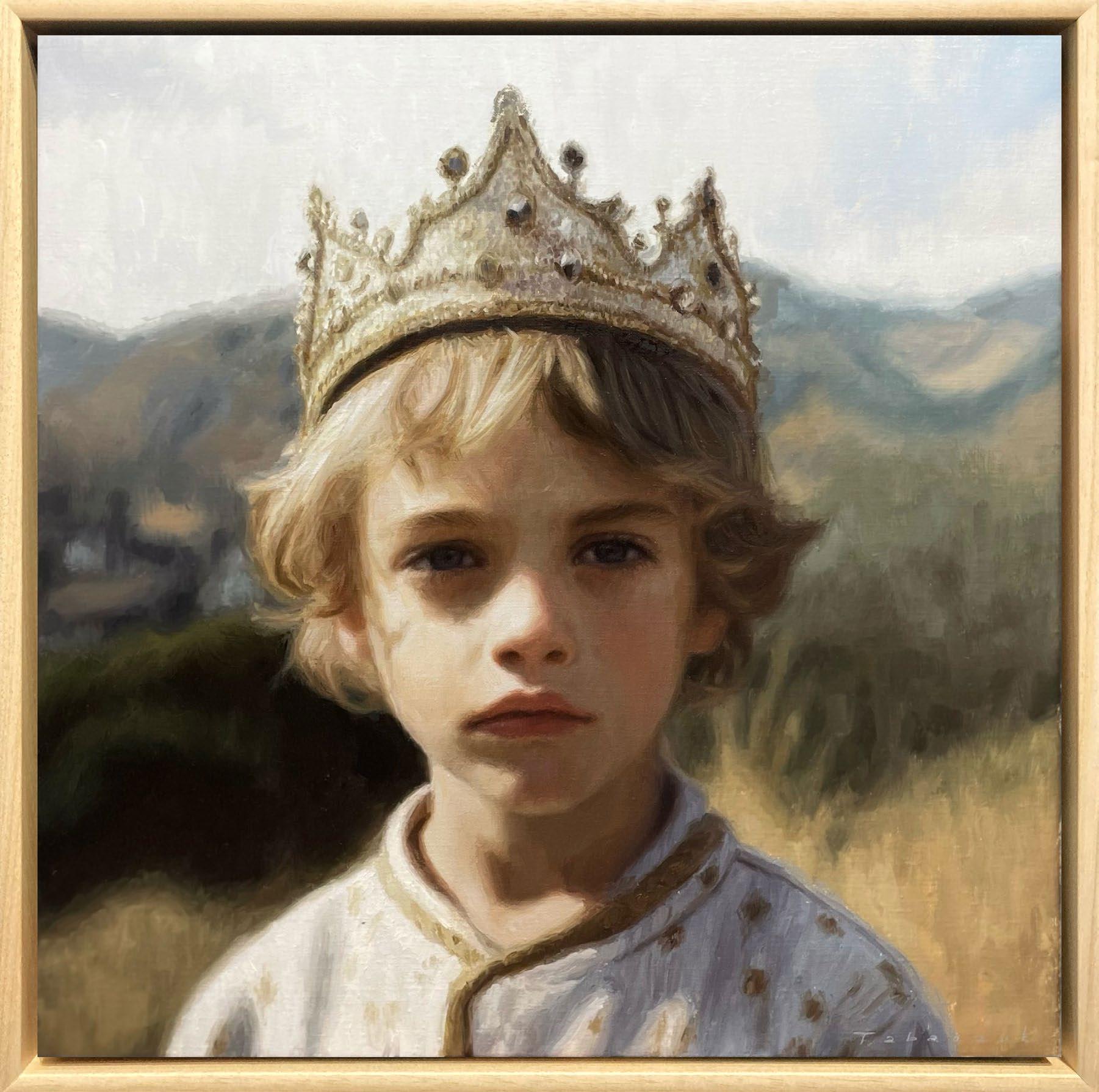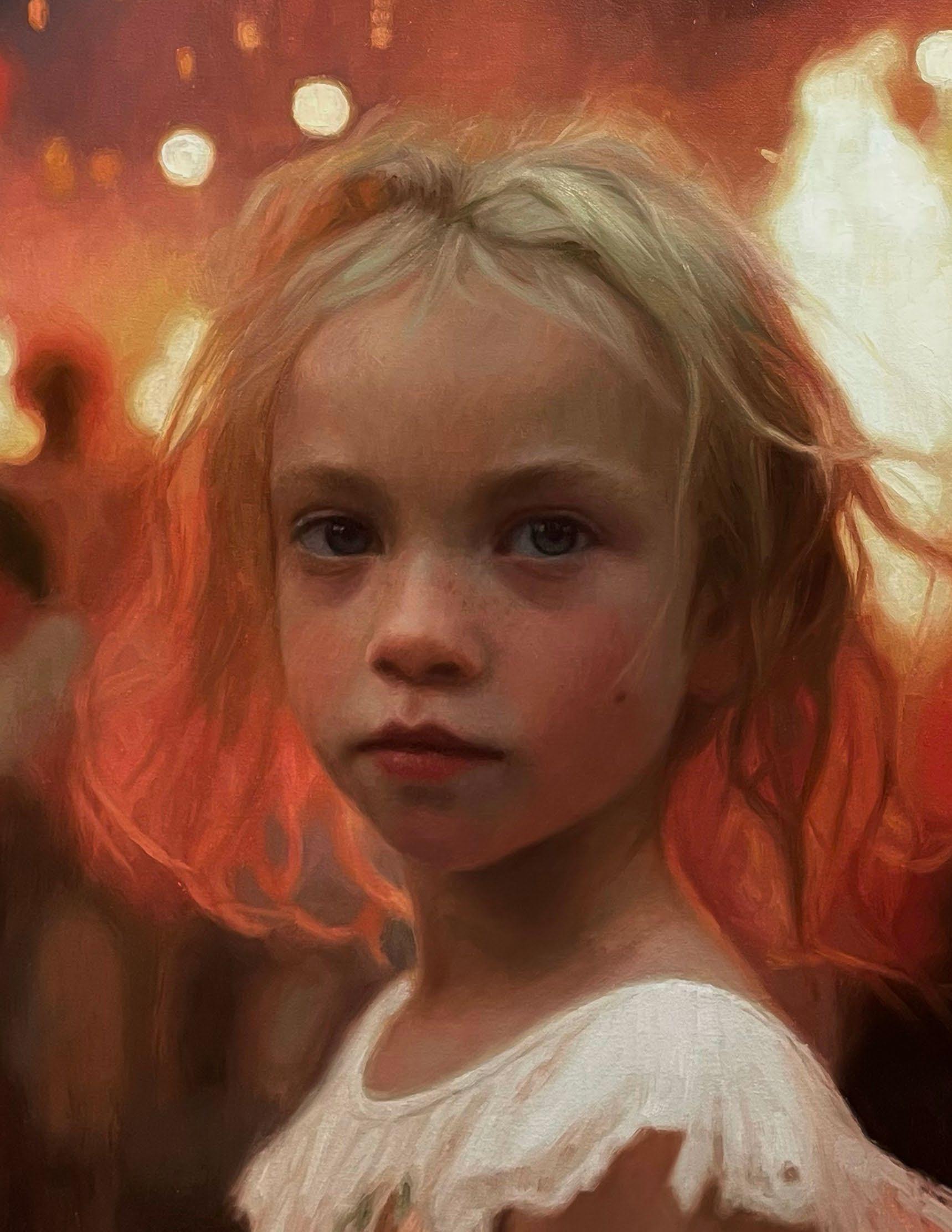 “Fields of Morning” explores themes of childhood nostalgia and the beauty of everyday moments. Tabaczuk draws influence from the emotive, candid style of Diane Arbus, juxtaposed with her own idyllic countryside childhood in Eastern Europe. Her creative process begins with extensive photo sessions to find the perfect moment, often taking up to a thousand photos. Starting with the eyes to ensure the portraits remain her focal point, Tabaczuk then turns her attention to the backgrounds and additional elements, which are added to complement, but not overshadow the main subject. This thoughtful approach allows her to convey subtle emotions and expressions, making each painting a unique narrative.