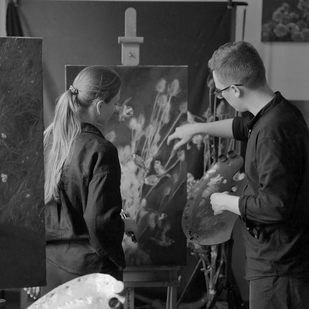 Originally from Kyiv, Ukraine, artists Anhelina Holembivska (b. 1996) and Andrii Kateryniuk (b. 1994) live and work in Florence, Italy, where they share a studio and a deep commitment to classical painting traditions. Both are graduates of the Academy of Fine Art in Kyiv and the Accademia di Belle Arti in Florence, and their practices reflect a mutual respect for careful observation, technical rigor, and emotional depth.