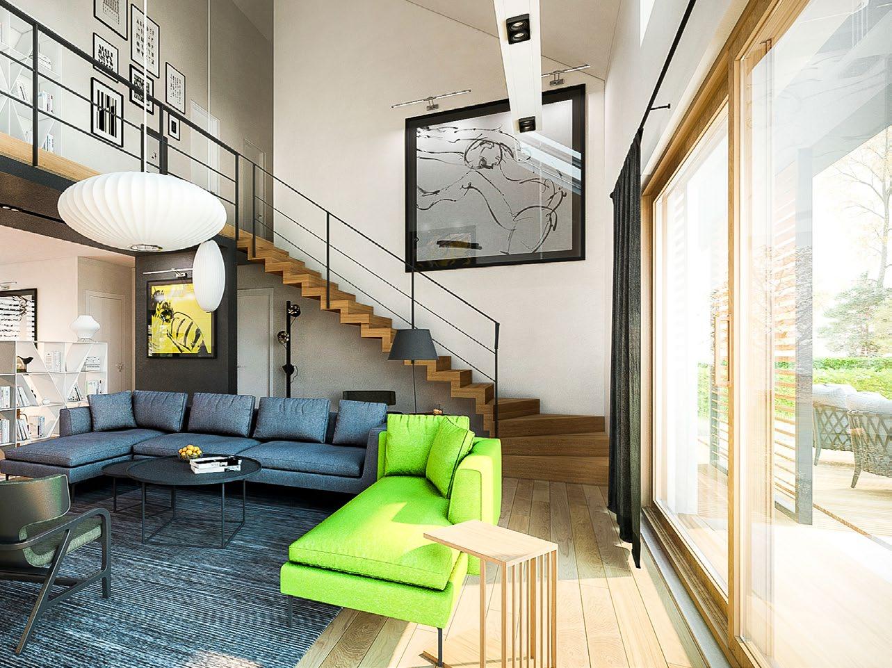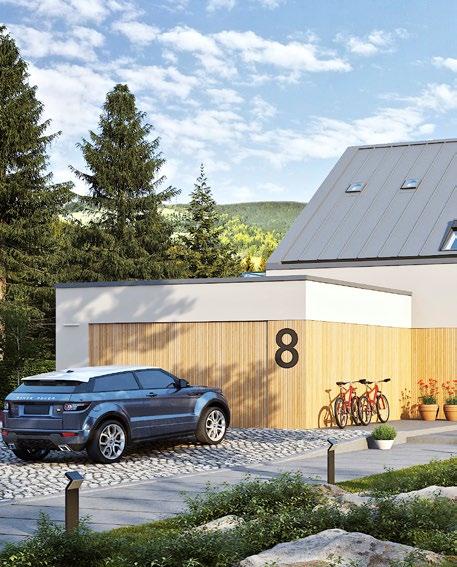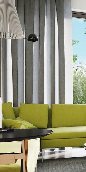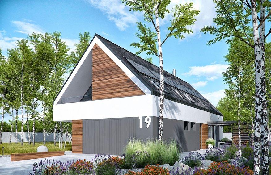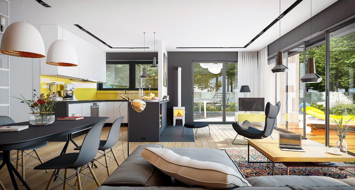 EX 19 G2 ENERGO PLUS to dom, w którym każdy poczuje przypływ pozytywnej energii. Wizytówką projektu jest przeszklona witryna ogrodowa, dzięki której granica między wnętrzem a otoczeniem subtelnie się zaciera, tworząc wrażenie otwartej i niczym nieskrępowanej przestrzeni. Panoramiczny widok na krajobraz, naturalne światło swobodnie przenikające do środka, intensywne poczucie jedności z naturą – to wszystko sprawia, że codzienne użytkowanie domu jest niezwykle przyjemne i komfortowe. W proponowanej aranżacji strefa dzienna efektownie prezentuje się w soczystych, energetycznych kolorach. W jadalni rządzi optymistyczny żółty, w salonie – wyciszająca zieleń. Przytulny urok całości podkreślają drewniane detale oraz dekoracyjne oświetlenie, które pozwala stworzyć odpowiedni nastrój wnętrza.