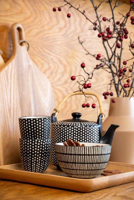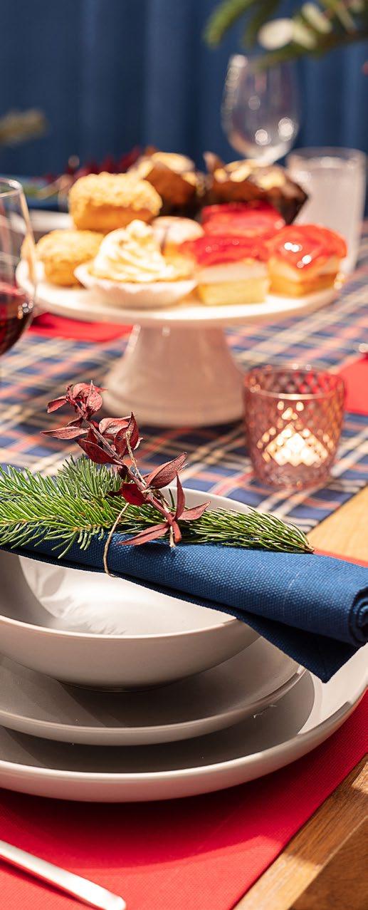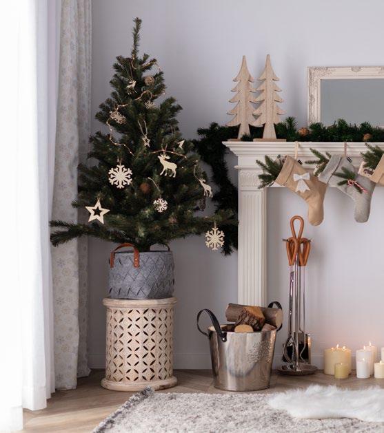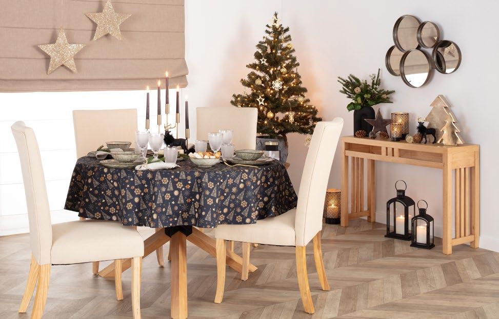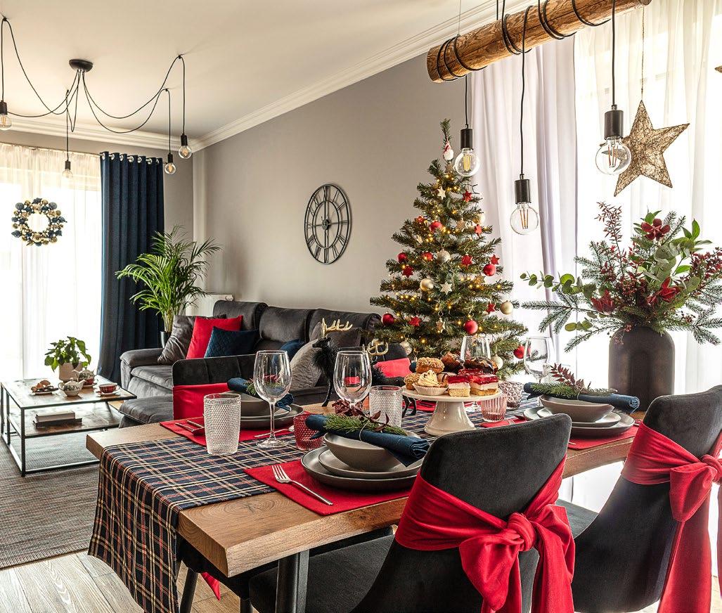 Efekt świątecznej elegancji w gwiazdkowy wieczór zagwarantuje połączenie beżu i czerni. Skandynawski charakter aranżacji podkreślą drewniane meble oraz jasna kolorystyka, przełamana ciemnymi akcentami np. obrusem w świąteczny wzór, lampionami czy wazonem o matowym wykończeniu. Naturalne piękno żywej choinki warto wyeksponować dekoracją na lnianych serwetkach. www.dekoria.pl