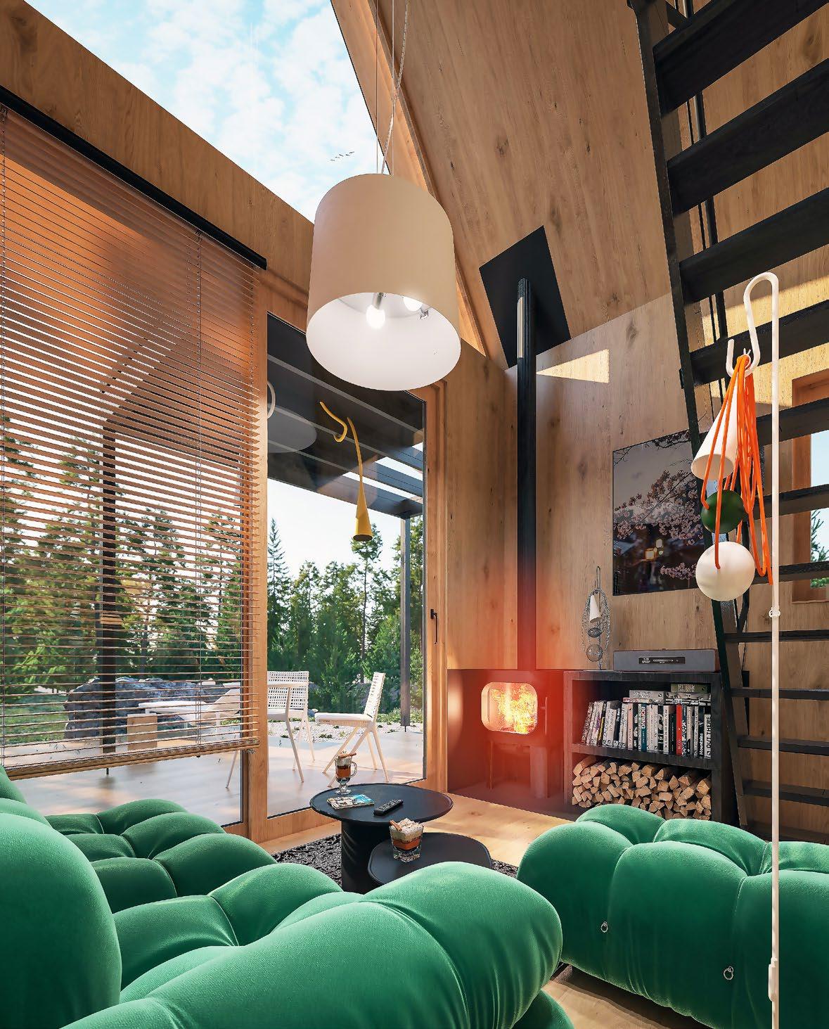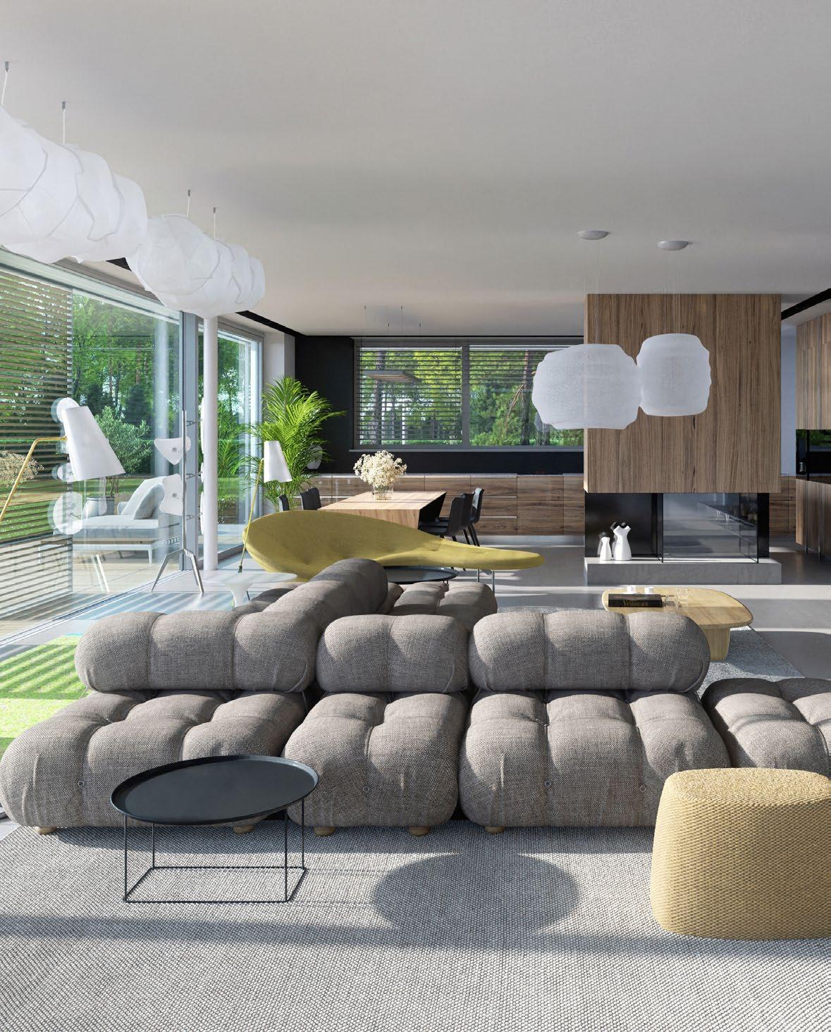 Projekt Alison IV G2 będzie świetnym wyborem dla miłośników życia blisko przyrody. Wnętrze domu to przestrzeń pełna naturalnego światła i dobrej energii szlachetnych detali. Salon w bieli i szarościach stylowo prezentuje się w towarzystwie naturalnego drewna, która wprowadza do środka ciepło i spokój. Aranżację uzupełniają ciekawe dodatki, m.in. oryginalne poduszki inspirowane malarstwem holenderskiego malarza Pieta Mondriana. Otwarty charakter strefy dziennej zachęca domowników do wspólnego gotowania i rodzinnego relaksu w blasku nastrojowego kominka – jest nowocześnie, jednocześnie bardzo przytulnie. Jeśli marzycie o domu, w którym widok na ogród zastępuje obrazy, a taras jest harmonijnym przedłużeniem salonu, jadalni i każdej sypialni – ten projekt jest właśnie dla Was.