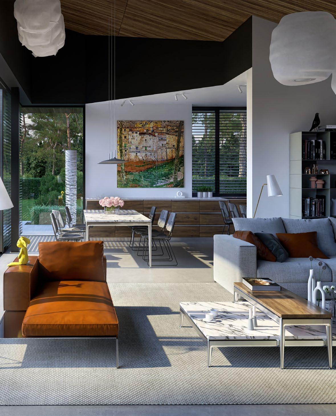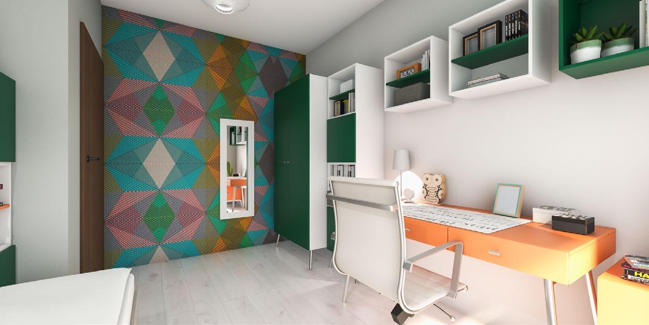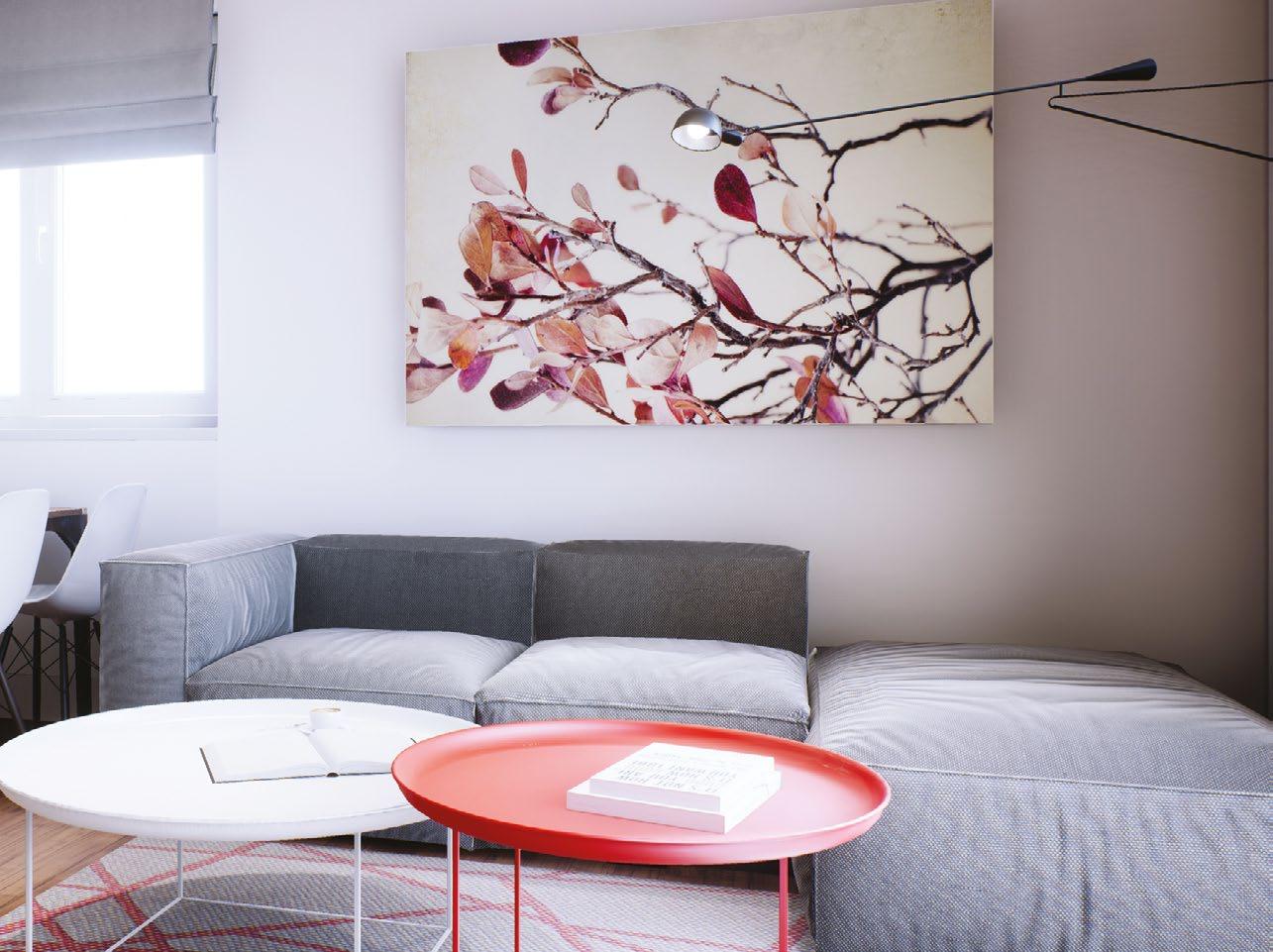 Aranżacja została stworzona z myślą o parze dojrzałych osób, które pracują zdalnie, spełniając się w tzw. wolnych zawodach. Stylistka VOX zwróciła uwagę na harmonijne połączenie wystroju z nowoczesną architekturą oraz naturalnym otoczeniem. Prostota i stonowane barwy, przełamane akcentem kolorystycznym oraz nieduża ilość mebli i dodatków to punkty orientacyjne aranżacji. Wygodna sofa modułowa Pelo marki VOX w czarnym kolorze stanowi mocny i wyróżniający się akcent całej strefy. Karmelowe fotele z tej samej kolekcji uzupełniają i ocieplają wnętrze. Ścianę salonu zdobią nowoczesne obrazy Lamar w dębowych ramach, dostępne na vox.pl. Pomimo niewielkiego metrażu, w parterowym domu z płaskim dachem znalazło się komfortowe miejsce do pracy dla dwojga. Dwa połączone ze sobą rozkładane stoły Creative w kolorze szafranu, na metalowych płozach, stanowią wygodną bazę do wykonywania zawodowych obowiązków. Wspólną przestrzeń roboczą dzieli sprytny parawan Calmo, który pozwala domownikom zachować pełne skupienie podczas mniej lub bardziej wymagających zadań.