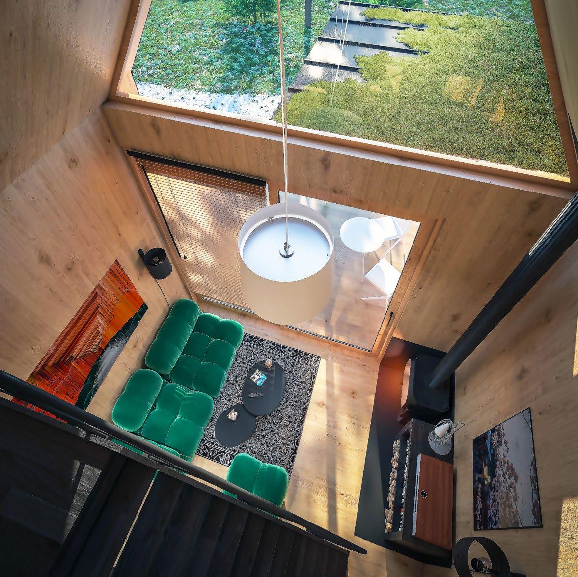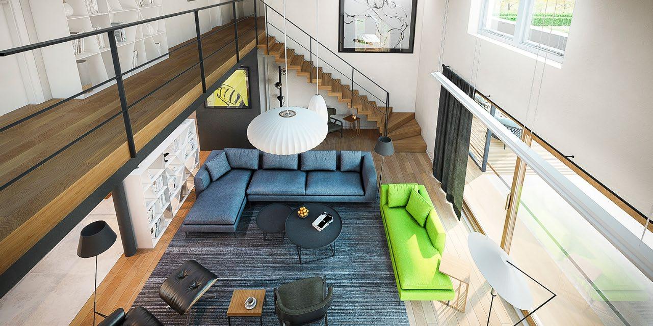 EX 18 G2 ENERGO PLUS to komfortowy dom w typie nowoczesnej stodoły. Jego wizytówką jest zachwycająca strefa dzienna – wysoki na 4,9 m salon przenikający się z jadalnią i poddaszem oferujący domownikom luksus przestrzeni i wspaniały widok na ogród. W centralnej części parteru mieści się wygodna kanapa, obok której znalazł się podręczny regał na książki wyznaczający jednocześnie symboliczną granicę między strefą relaksu a jadalnią. Nad centrum życia rodzinnego dumnie góruje piękna lampa Bubble firmy Modernica. Uwagę zwraca również kultowy fotel Eames Lounge, na którym można przyjemnie odpocząć w domowym zaciszu. Atrakcyjnym elementem prezentowanej aranżacji są lekkie schody wiodące na antresolę – nie zamykają przestrzeni i stanowią dodatkową, oryginalną dekorację podkreślającą nowoczesny charakter domu. Zawieszona nad salonem wydzielona prywatna część na półpiętrze to świetne miejsce na domową biblioteczkę, a także doskonały punkt widokowy, gdzie swobodnie przenika zarówno ogrodowa zieleń, jak i błękit nieba.