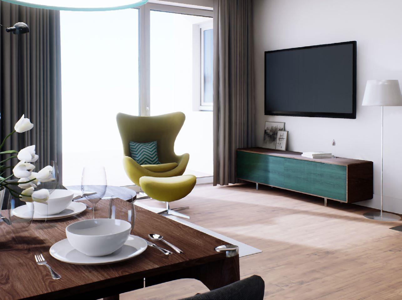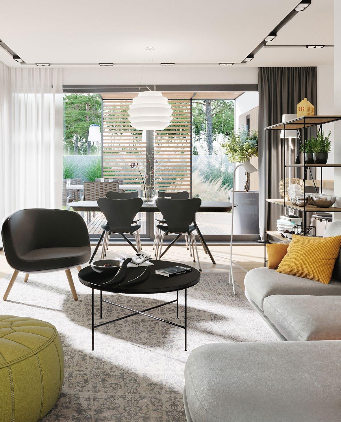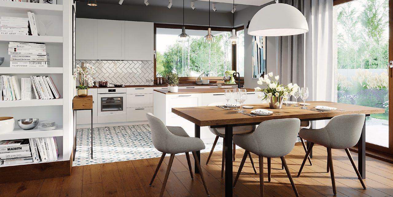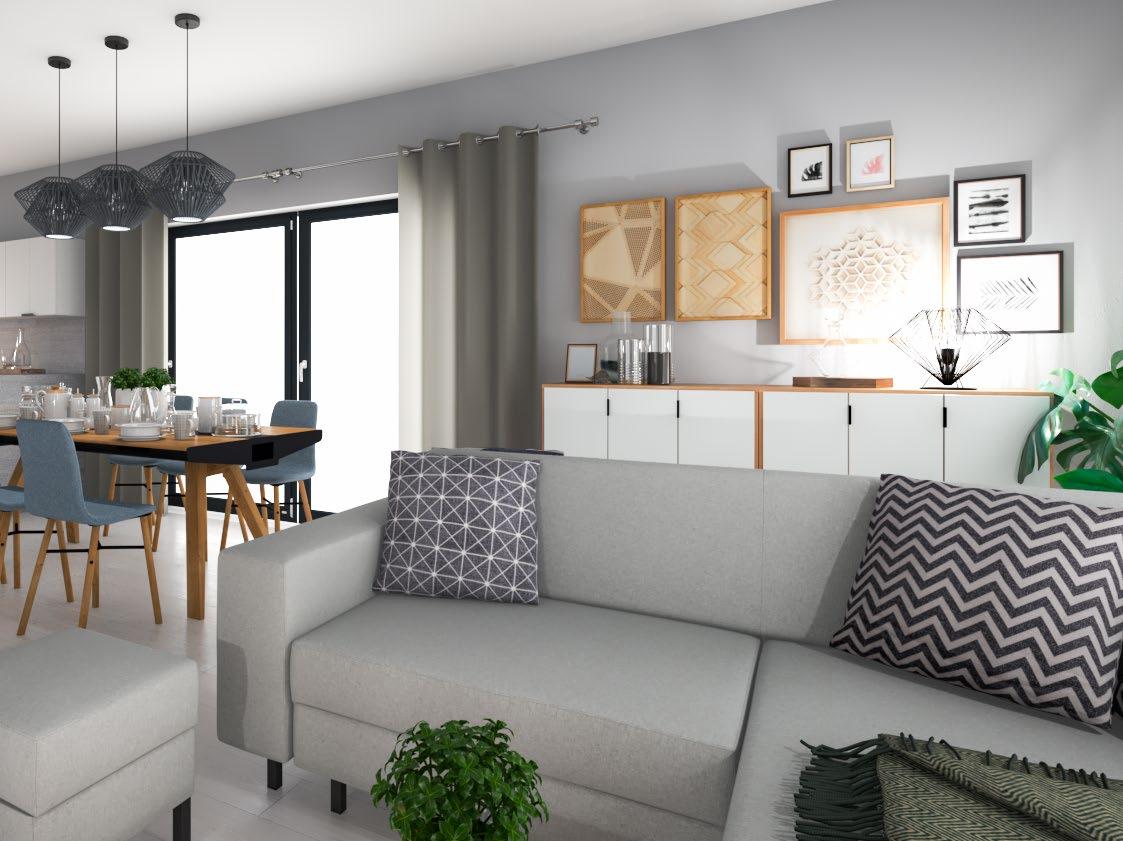 Aranżacja domu Simon IV G2 stworzona została z myślą o rodzinie ceniącej sobie spokój, porządek oraz stonowaną kolorystykę. W wystroju dominują kolory ziemi: biel, beż, szarość, czerń i ciemniejszy odcień drewna, który został zastosowany na podłodze oraz w stolarce drzwiowej. Mocniejszym akcentem pojawiającym się w całym domu jest zieleń. Wprowadzenie do wnętrza elementów, które zbliżają nas do natury pozytywnie wpływa na nastrój i koi zmysły. Żywe rośliny oraz oprawione w ramki grafiki z botanicznymi motywami pomagają się zrelaksować i pięknie komponują się z widocznym przez panoramiczne okna ogrodem. Z założenia miało być elegancko, stylowo i funkcjonalnie, stąd dużo miejsca do przechowywania. Całość została zaprojektowana bardzo uniwersalnie, z zastosowaniem spokojnych barw, które kreują klimat odprężenia i jednocześnie dają poczucie, że przebywa się w ponadczasowym wnętrzu. Mocniejsze kolory pojawiają się jedynie w dodatkach, które mają definiować styl, ale nie zaburzają panującego spokoju. W zależności od pory roku, wnętrze można odświeżyć zmieniając jedynie kolor dekoracji. Wizualizacje zostały przygotowane w programie VOXBOX dostępnym na vox.pl