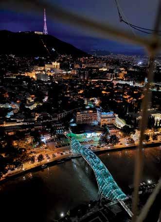 testimonianze di epoca sovietica, si riconoscono appena nella penombra, creando una scena dai contorni indefiniti. Raggiunto il fiume Kura, si intravedono, sulla riva opposta, le luci tenui del nucleo antico. Uno sguardo panoramico offre una vista dei progetti iconici made in Italy degli architetti De Lucchi e Fuksas, simboli figli della Rivoluzione delle Rose dei primi anni Duemila. Una luce più discreta valorizza la statua del re Vakhtang Gorgasali che, di fronte alla chiesa di Metekhi, richiama le radici cristiane ortodosse e dalla cui posizione domina le cupole di bagni sulfurei della città antica. Dall’altro lato, la maestosa statua Kartlis Deda, la madre Georgia, funge da richiamo al passato millenario glorioso e, contemporaneamente, da monito di benvenuto e rispetto.