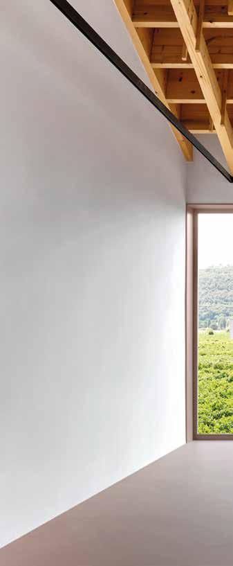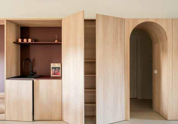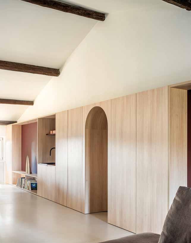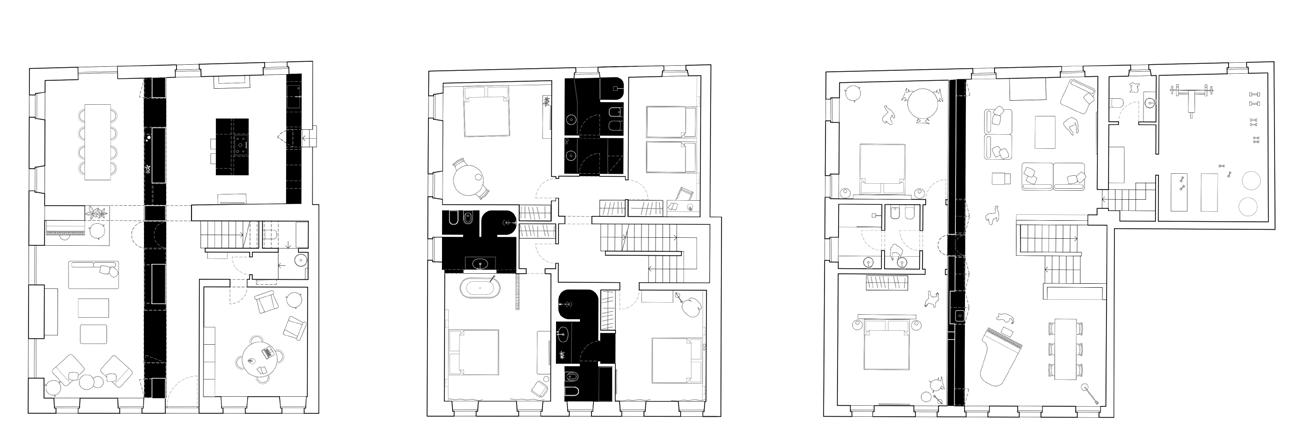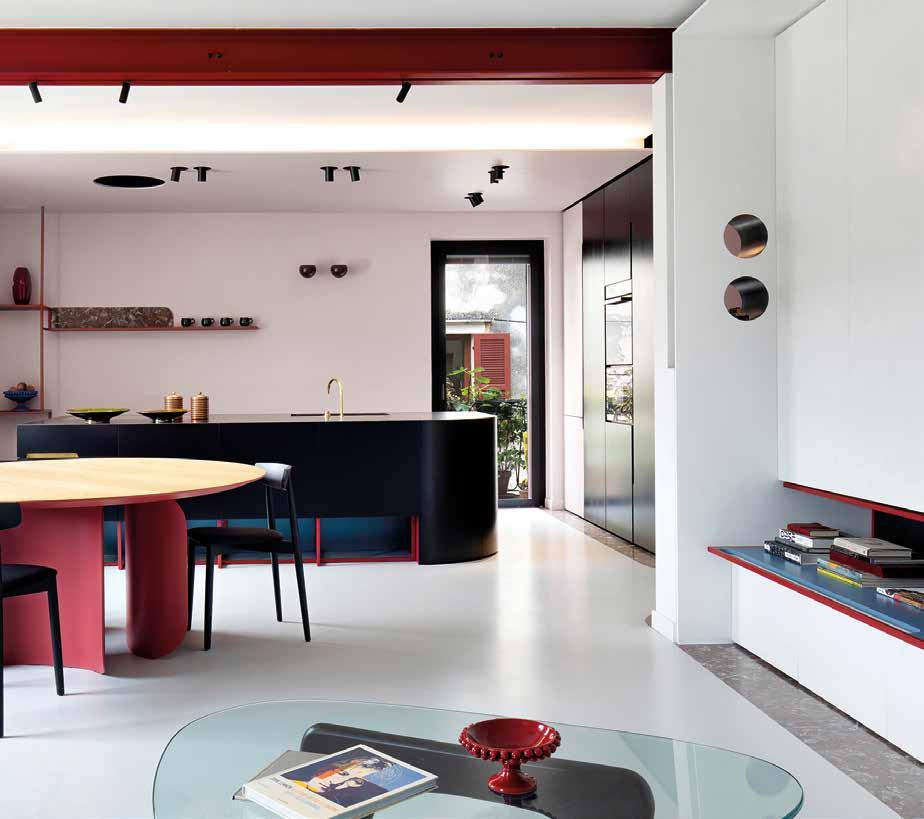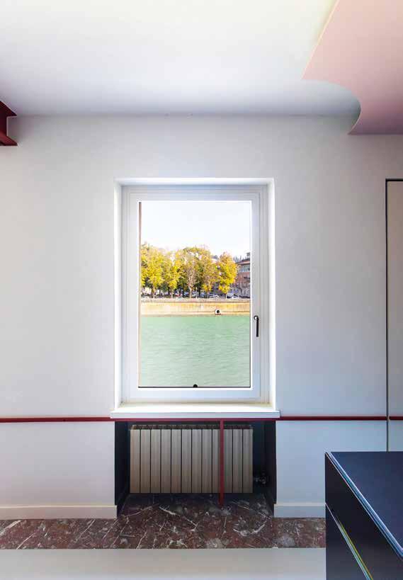 il posto a una trave composta da due UPN color rosso veneziano satinato; un binario elettrificato interposto fa diventare l’elemento strutturale un apparecchio illuminante. Nel corridoio si snoda un volume ligneo laccato con tre porte scorrevoli alte 2.7 metri, ognuna con una maniglia dal disegno diverso e colorata internamente di nero. Infine il decoro e i giochi di lame dei controsoffitti accompagna no un’impiantistica rinnovata per ogni stanza.