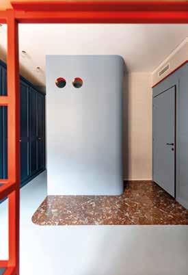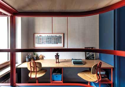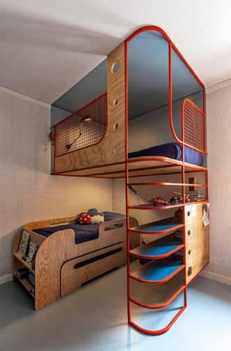 Pensando ai meccanismi dei mulini, in ogni stanza si trovano telai in ferro complementari ai volumi e ai piani d’arredo, dalle mensole dietro l’isola cucina al letto a castello con scale e librerie, dalle scrivanie ai comodini e ai lavandini; oppure elementi di divisione tra due finiture della stessa parete. Nel bagno per i bimbi il colore del lavabo d’appoggio è applicato alle fughe delle piastrelle e alle pareti, a contrasto con il telaio porta asciugamano in arancione aragosta, tanto da sembrare un bagno del Nautilus.