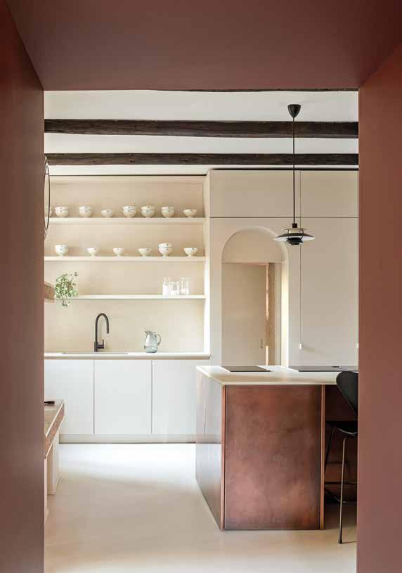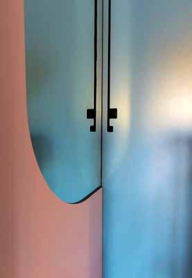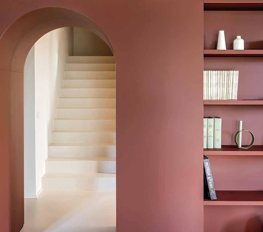 Il colore della zona giorno è un tono di rosa campionato dal marmo rosso Levanto, cui si contrappone un ottanio. Il muro che divideva i due locali precedenti ha lasciato