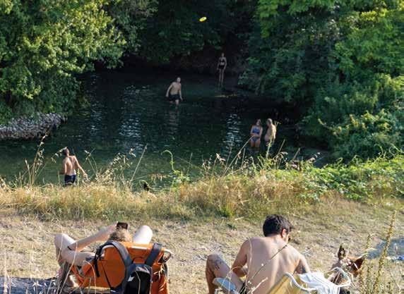 Il Fontanin, il fontanile di Villafranca, allora appare come un miraggio lungo un sentiero di assolata campagna. Si manifesta da lontano come un’area boschiva abbastanza contenuta, circondata dai campi e caratterizzata dalla presenza di una statua di Sant’Andrea, eco del luogo in cui un tempo sorgeva la chiesa di Sant’Andrea al Fontanile, ritenuta una tra le più antiche pievi di Villafranca. Avvicinandosi, ci si accorge che gli alberi sono disposti sul perimetro di una sorta di cratere profondo circa sei metri, sul cui fondale brilla nella penombra l’acqua viva che perennemente sgorga dalla tubazione verticale posizionata al centro del fontanile. Una serie di gradini, ricavati con assi di legno, conduce a due livelli di terrazzamenti modellati sui margini della cavità. È qui che le persone allestiscono il loro giaciglio, portano teli e sdraio per prendere il sole, tavolini e sedie per giocare e mangiare in compagnia godendo dell’aria un po’ più fresca che soffia dal basso. La pozza è poco profonda, l’acqua è fredda e arriva poco sopra le ginocchia, i bambini giocano, gli anziani si rinfrescano e tutti insieme godono di un pò di refrigerio. Tutto questo senza pagare un biglietto, impegnandosi solamente a rispettare la natura e a convivere in armonia con le altre persone divenendo luogo di vera inclusione sociale.
