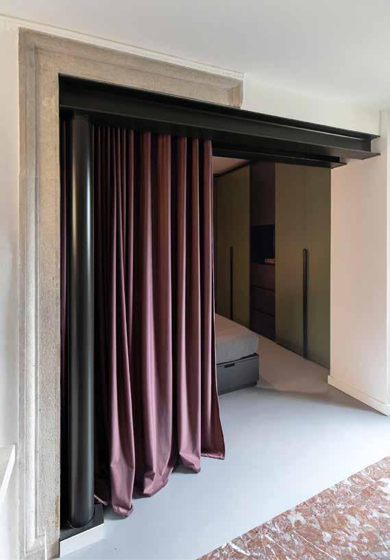 06. La stratificazione di un portale in acciaio e di un portale in pietra diventa supporto di un tendaggio divisorio.