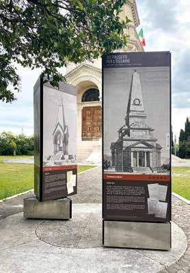 Borgo Roma è uno dei quartieri più popolosi della città con 30mila residenti circa, di cui una buona parte giovanile (più del 20% tra i 15 e i 34 anni), e ospita, assieme all’ospedale, il polo scientifico dell’Università 1877 dal Comitato sorto per la realizzazione dell’Ossario. La disposizione dei periatti, collocati frontalmente al monumento, permette al visitatore la lettura comparata tra i progetti finalisti e il progetto vincente. Attraverso il traguardo visivo, il visitatore ha un’immediata percezione di alcune possibili alternative a quanto messo in opera. Il dispositivo, appositamente progettato da Carlo Saletti e Roberto Solieri, che ne hanno seguito anche l’aspetto storico e grafico, è stato realizzato dalla ditta LGF-Pubblicità di Villafranca ed è stato inaugurato sabato 17 maggio 2025. •