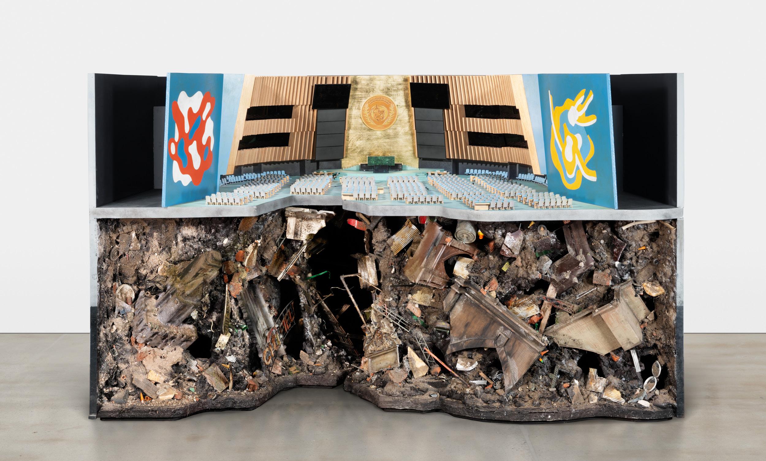 The upheaval reminds me of an artwork I stumbled across at Art Basel Miami last December: Cécile B. Evans’s Ad Hoc Order is a “six-part sculpture that photorealistically reproduces a scale model of the United Nations General Assembly Hall,” according to their gallery, Château Shatto. Beneath, a darkened, subterranean mass is actually a kit-bashed trash heap “imagined as a storage space for the plundered ruins of New York City.” Within the rubble, there are detectable bits of the metropolis, like the torch from the Statue of Liberty, a corner of the Flatiron building, signage from Citi Field, highway signs, a subway tile mural from Times Square, and more. The model, which depicts an imagined institution titled the Global Archive of Memory, comes apart in pieces to be able to be used as a set for futuristic films made by the artist about Reception, one of the last human translators in this world, and her double, a memory that has abandoned Reception's body. The model and films are on view at the Sharjah Biennial.