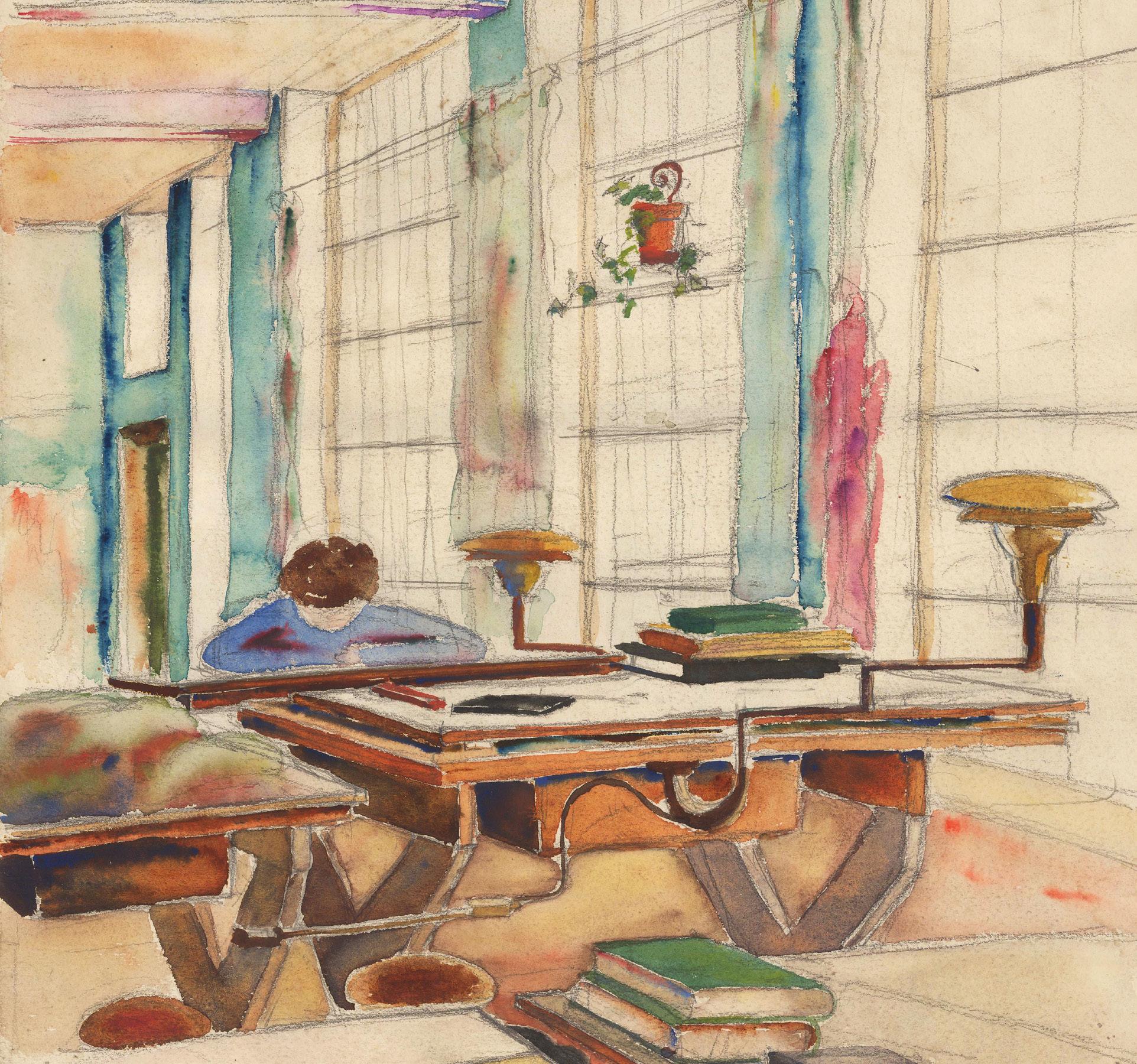 Elizabeth-Ann Campbell, watercolor of one of the Cambridge School’s drafting rooms (detail), c. 1936. Private collection