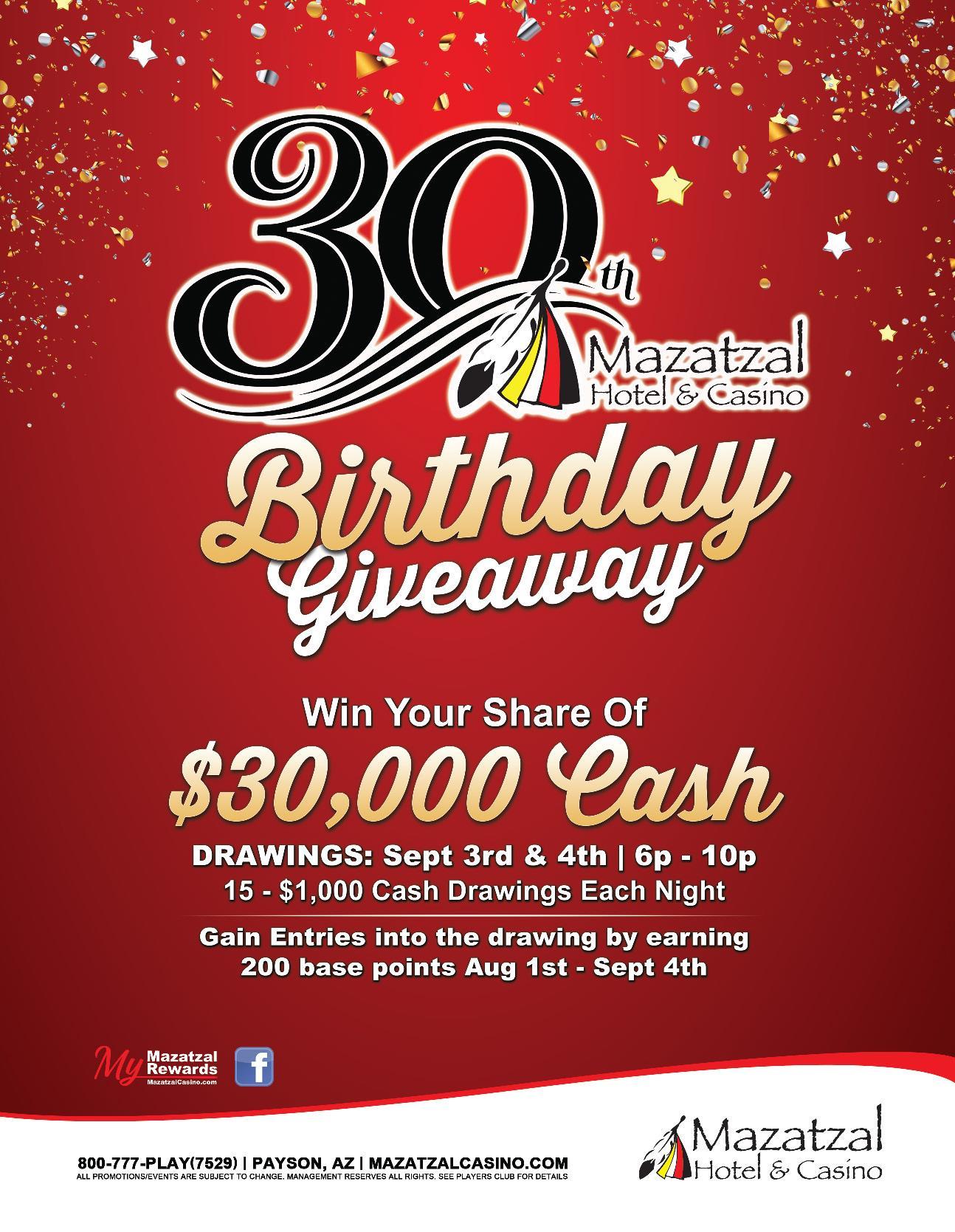 Septiembre del 25 al 30 ¡Reserva! ¡Únase a ellos para celebrar su 31.º aniversario en los casinos Bucky's y Yavapai! Juegue y gane su parte de hasta $33,100 en premios en efectivo. Los sorteos se llevan acabo los viernes y sábados, del 6 al 21 de octubre a las 7 p.m. en ambos casinos. También disfrute de los fuegos pirotécnicos a las 8 p.m. el sábado 21 de octubre.