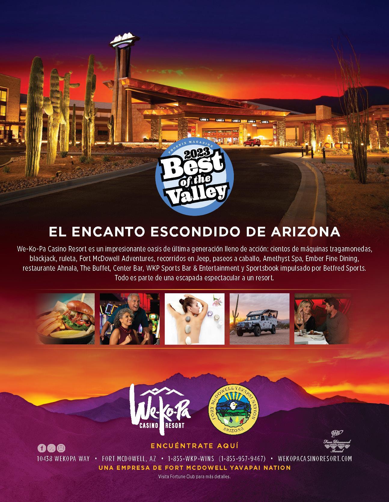 Desert Diamond Casino-W.V. 101 & Northern Ave. Glendale 833-332-2946 1,450 Sí Sí 14. Desert Diamond Casino-Why Hwy. 86, Milepost 55 Why 866-332-9467 40 Sí 15. We-Ko-Pa Casino Resort Hwy. 87 & Ft. McDowell Rd. Fort McDowell 800-843-3678 928 Sí Sí Sí Sí Sí Sí Sí Sí 16. Harrah’s Ak-Chin Casino 15406 N. Maricopa Rd. Maricopa 480-802-5000 1,135 Sí Sí Sí Sí Sí Sí Sí Sí Sí Sí 17. Hon-Dah Casino 777 Hwy. 260 Pinetop 800-929-8744 806 Sí Sí Sí Sí Sí 18. Lone Butte Casino 1077 S. Kyrene Road Chandler 800-946-4452 1,150 Sí Sí Sí Sí 19. Mazatzal Hotel & Casino Hwy. 87, Milepost 251 Payson 800-777-7529 397 Sí Sí Sí 20. Paradise Casino 450 Quechan Drive Yuma 888-777-4946 490 Sí Sí 21. Quechan Casino 525 Algodones Road Winterhaven, CA 877-783-2426 800+ Sí Sí Sí Sí Sí Sí Sí 22. Spirit Mountain Casino 8555 Hwy. 95 Mohave Valley 888-837-4030 176 Sí 23. Talking Stick Resort 101 & Indian Bend Scottsdale 480-850-7777 1,421 Sí Sí Sí Sí Sí Sí Sí Sí Sí 24. Twin Arrows Navajo Casino 22181 Resort Boulevard Flagstaff 855-946-8946 1,022 Sí 25. Vee Quiva Casino 6443 Komatke Lane Laveen 800-946-4452 1,224 Sí Sí Sí Sí 26. Wild Horse Pass Casino 5040 Wild Horse Pass Blvd. Chandler 800-946-4452 1,112 Sí Sí Sí Sí Sí Sí 27. Yavapai Casino 1505 E. Hwy. 69 Prescott 800-756-8744 252 Sí 14 Arizona Gaming Guide En Español | marzo 2024 | azgamingguide.com