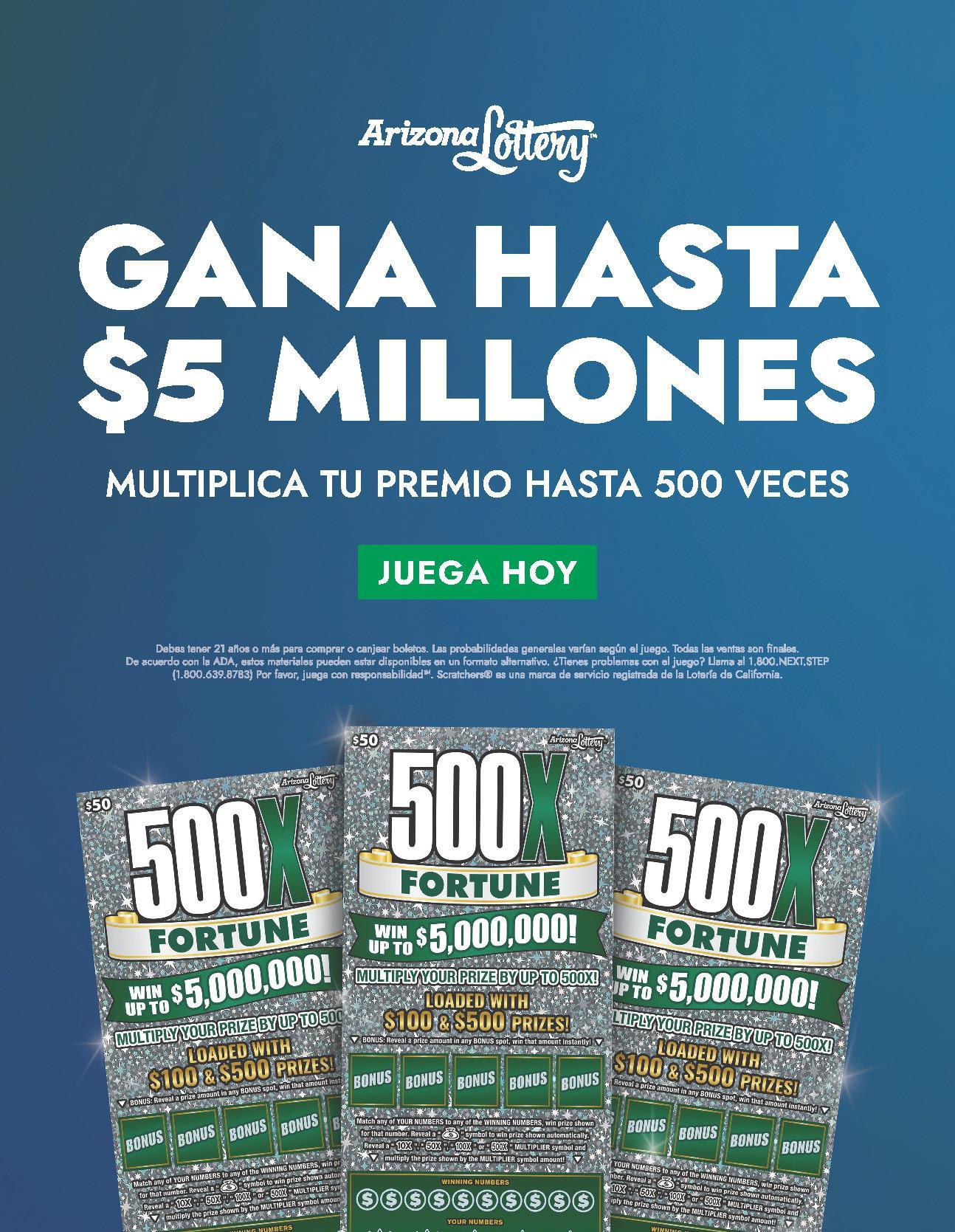 Para elevar aún más la experiencia de juego, Arizona Lottery añadió el 500X Fortune a la promoción Money Multiplier del Players Club, permitiendo a los boletos ganadores y no ganadores una segunda oportunidad de ganar hasta $100,000. Esta promoción se extiende hasta el 31 de marzo.