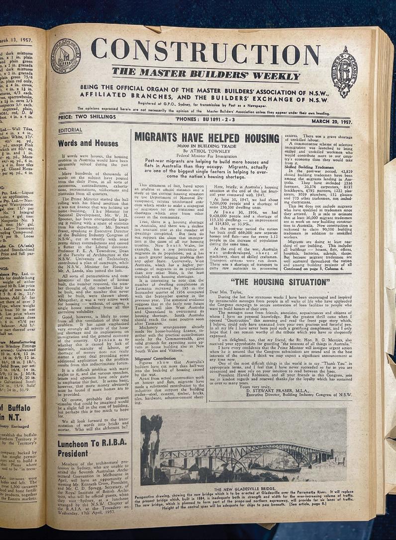 In 1957, Federal Minister for Immigration Athol Townley highlighted the role of postwar migrants in addressing Australia’s housing shortage. Migrants filled workforce gaps and helped build new homes. Nearly 70 years later, Australia faces a similar issue.