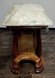 The single-panel top is fitted into a rectangular frame above a narrow waist and slightly wavy aprons raised on legs terminating in horsehoof feet. The panel depicts eight ladies hanging out in a lavish garden. George Zee & Co. was in business in Hong Kong from the 1960s until 1997. The company used different metal tags to label its furniture. One of the tags lists the company as “Kiln Dried Art Carved Manufacturers.” The company made heavily carved teak and camphor wood furniture. Later, furniture made by other manufacturers was sold under the George Zee name.