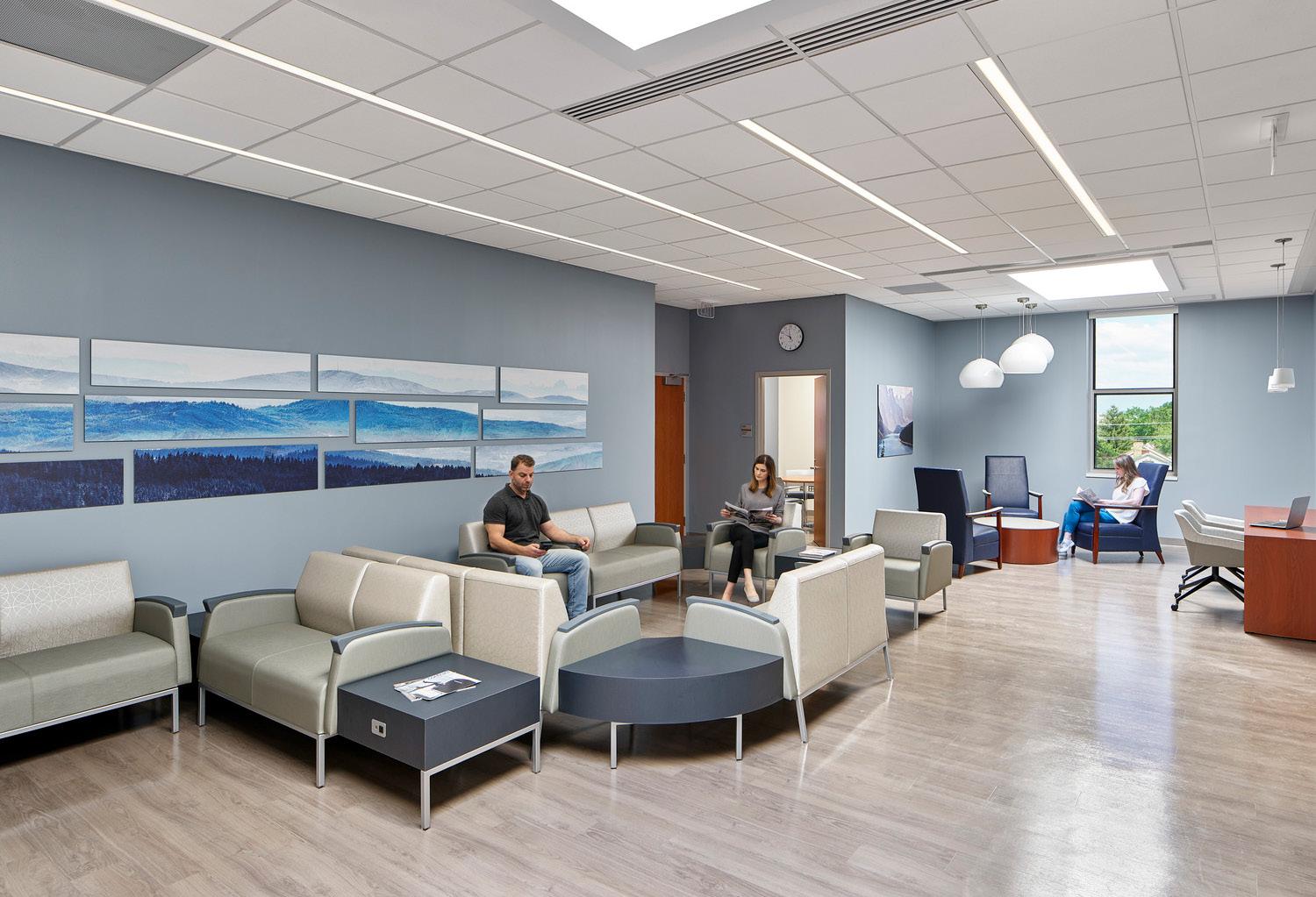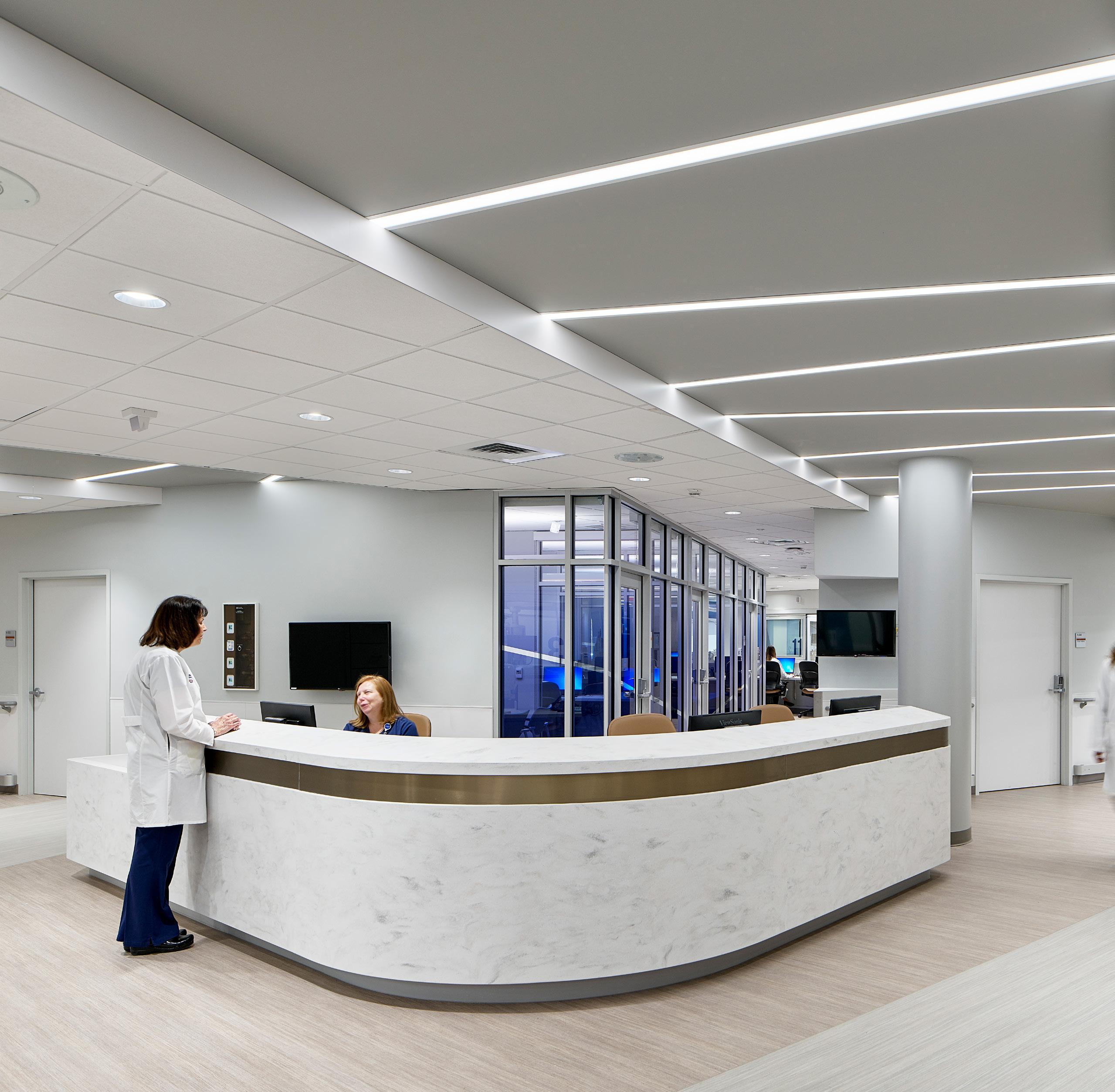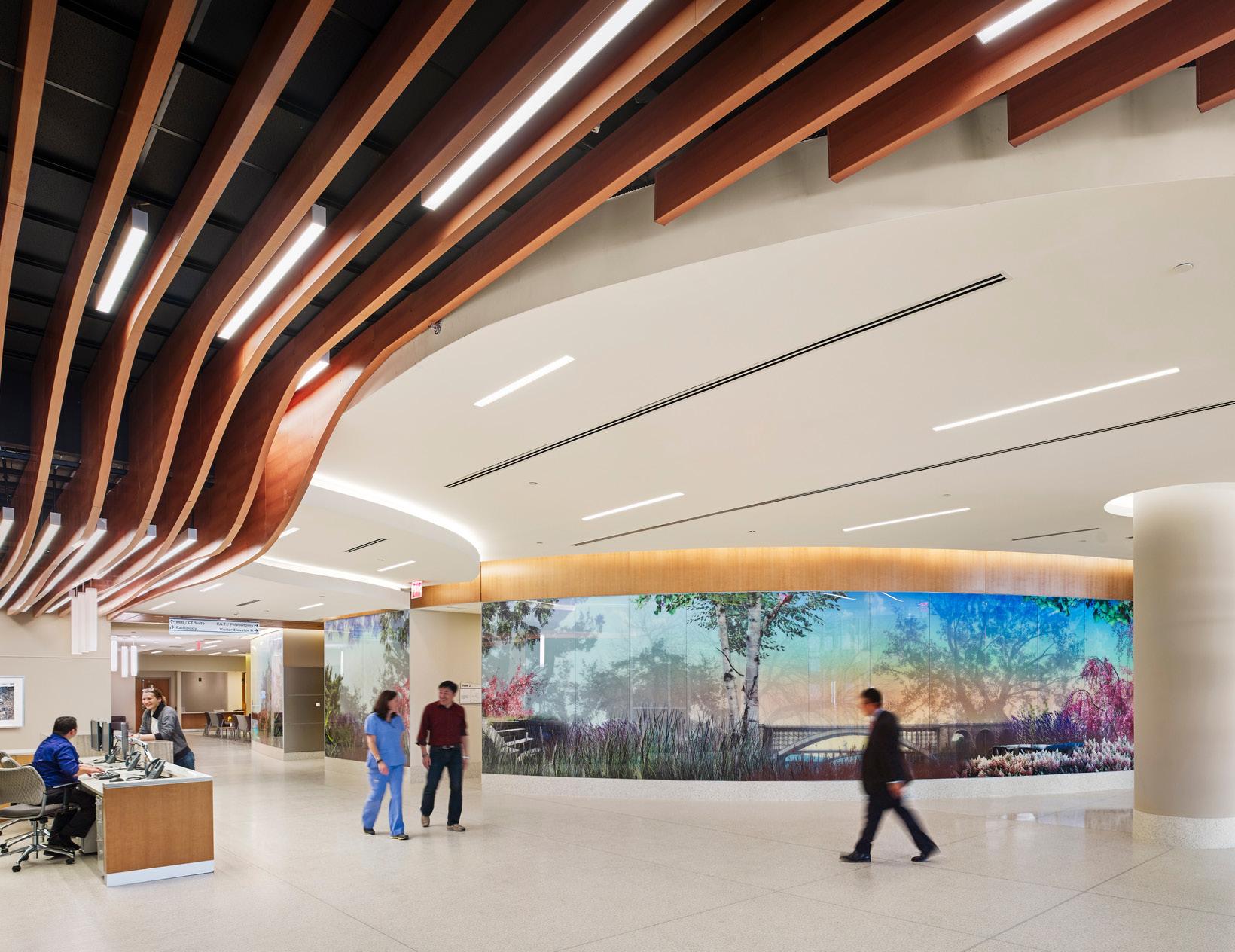 The design centers on the patient experience by incorporating artful details, an abundance of natural light and clear wayfinding for seamless transitions for patients, staff and materials. The lobby is inviting with an 80-foot mural depicting natural landscapes lining the curved walls and is accompanied by an open information desk and ample seating for patients and visitors.