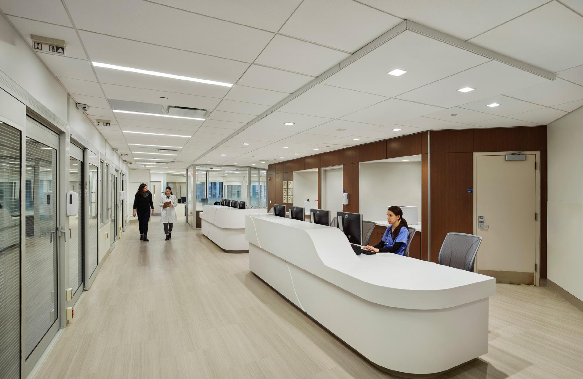 New reception, waiting rooms, administrative stations, and storage/support spaces were designed to match the high level of finish throughout the expansion.