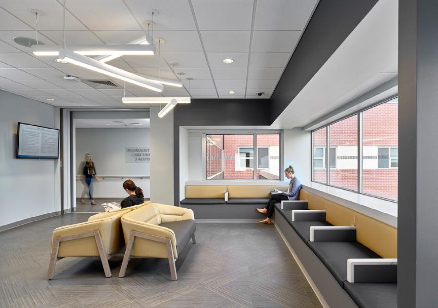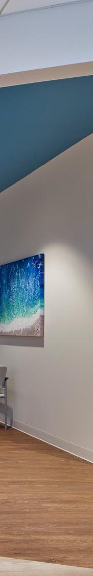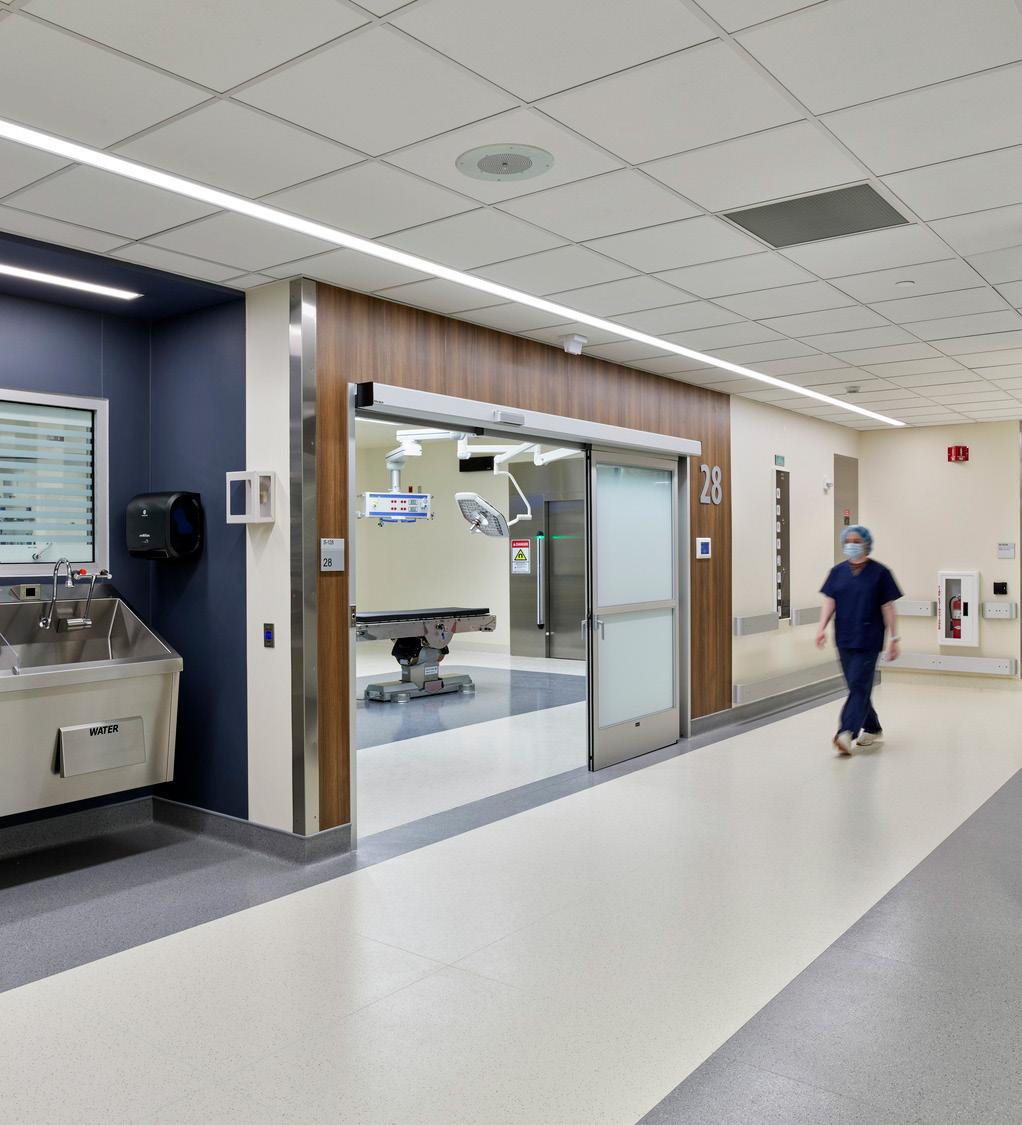patients from the family waiting area with its focal skylights to the pre-operative suite with its unique lit soffit, and continues through the recovery suite for a more gentle lighting effect. The neutral finish throughout brings focus to clinical touch points by adding warmer wood tones at the clinical work areas.