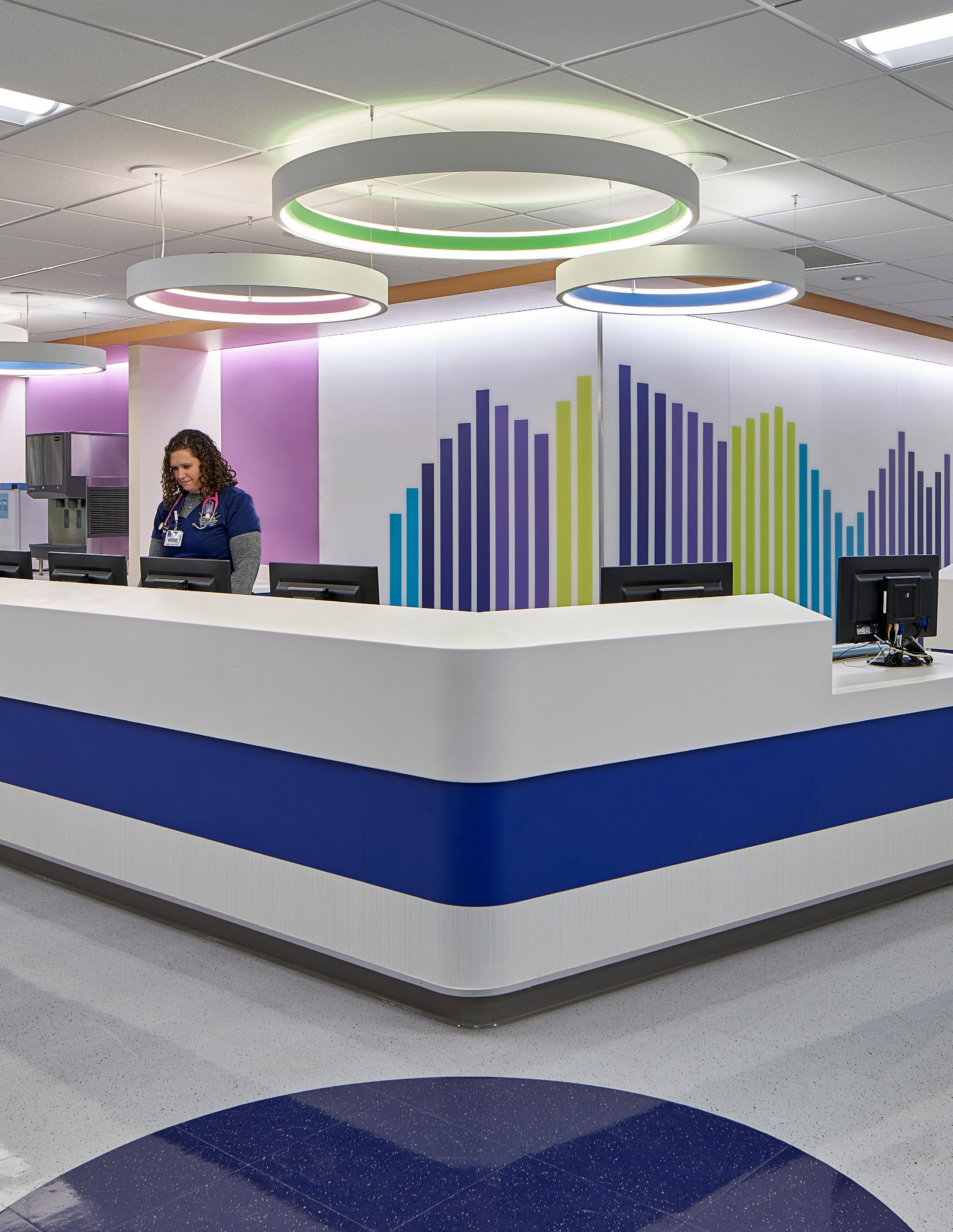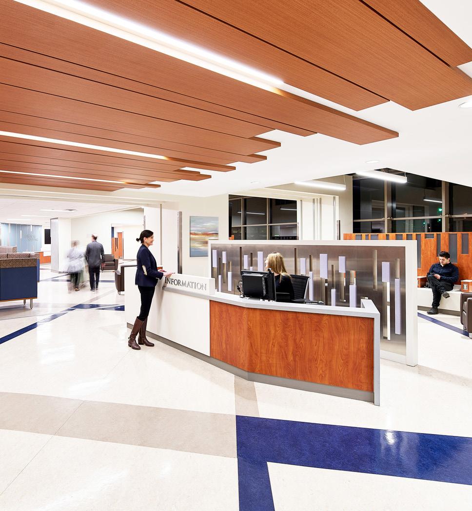 The waiting and public lobby is one of the first spaces patients and families experience when arriving at the campus. The space has a presence from both the interior and exterior, giving the design team the opportunity to make a statement. Linear decorative panels frame the main elevators, drawing attention to the information desk as they wrap the ceiling into the two-story space.