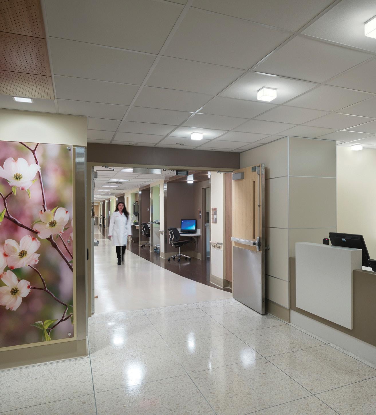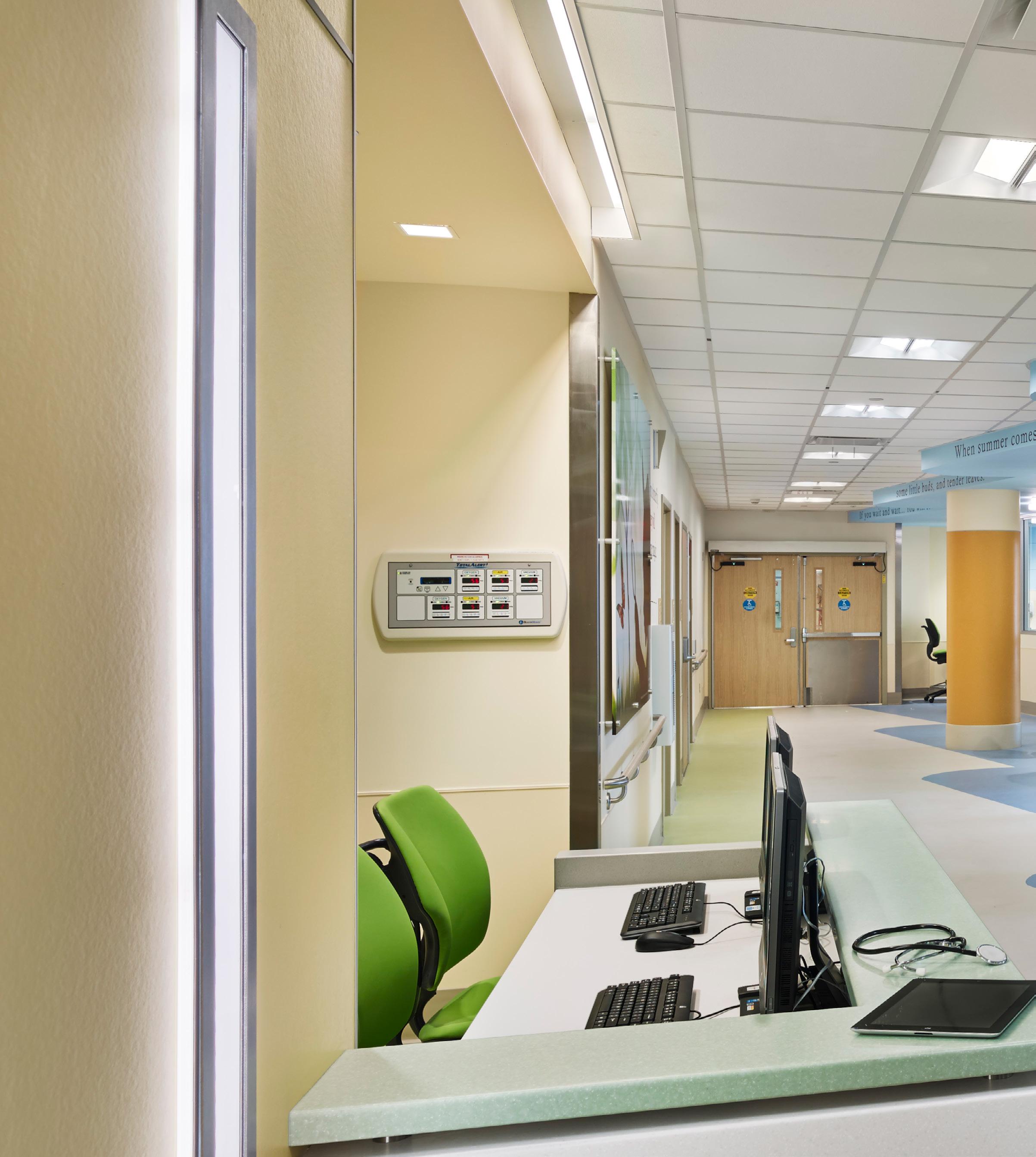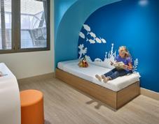 Rooms are light-filled and spacious, and breakaway doors support quick treatment scenarios. The hospital’s literary theme— Learning through Literature—was brought to life in both units. This growth and enrichment theme appeals to a large age range and provides positive distractions for patient and family alike.